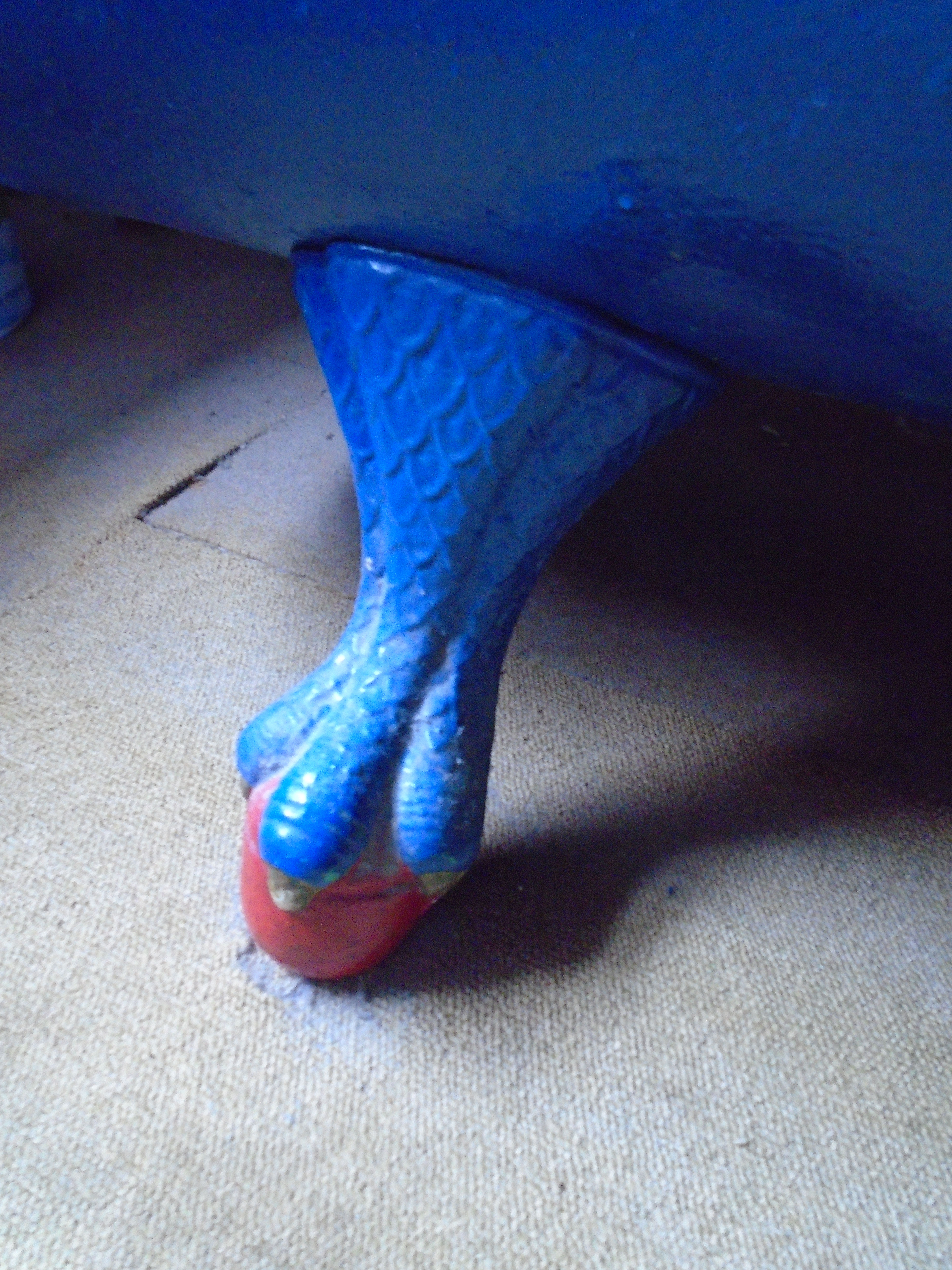 We moved into our house in 1979 and somehow never got round to replacing the bathroom fittings. The bath taps (and the maze) are recent, but the bath, sink, and sink taps are original (although I don't know how old they are). But we did paint the outside of the bath, to high-light the splendid legs!