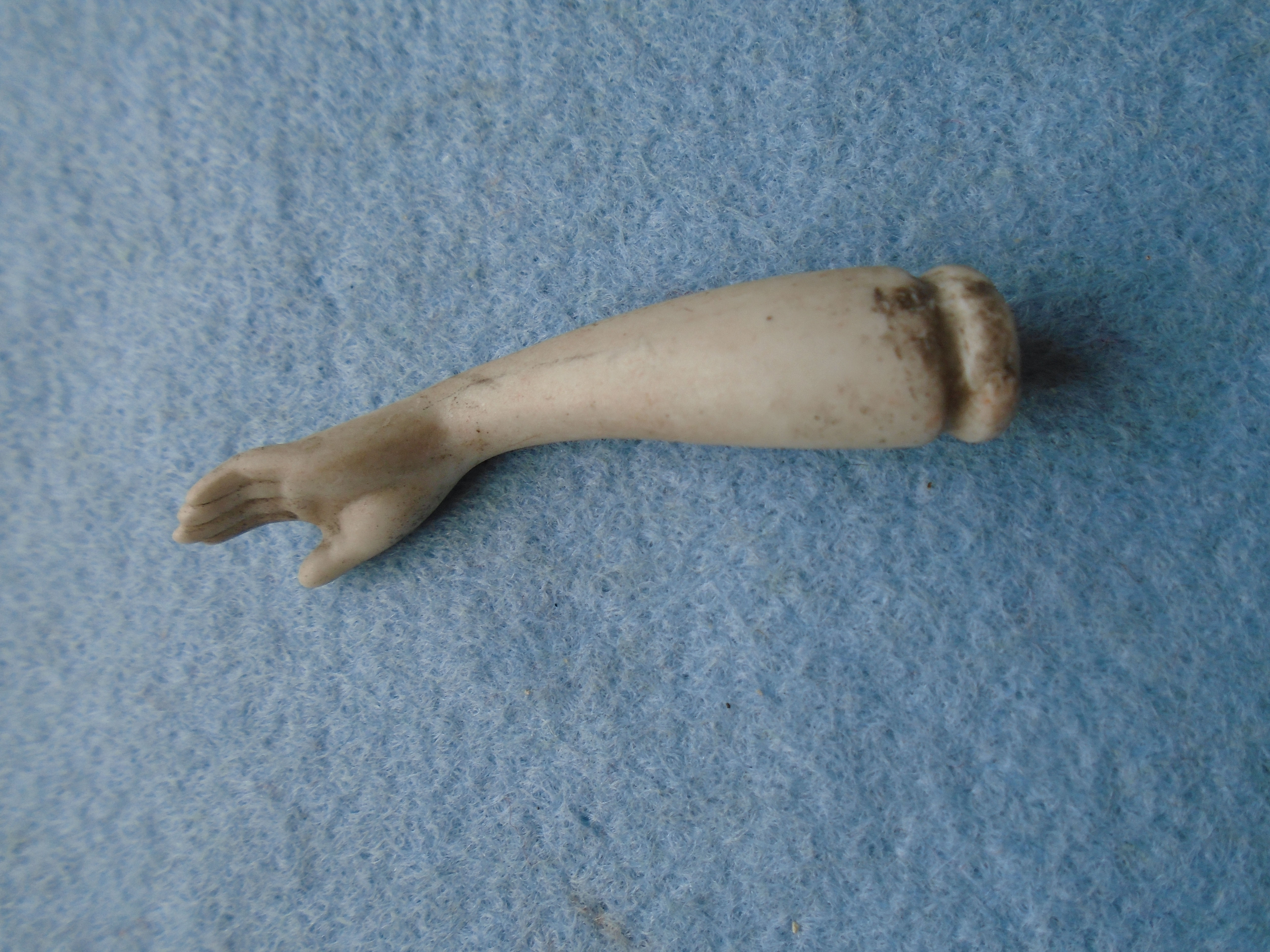 There are various pieces of dolls. They are not all the same doll, as the size and style varies. Even the pink bit is part of a doll's face - you can see a bit of eye lashes. I wondered if these dols, being made of china, broke, and the little girls decided to have a funeral, and buried them in the garden!