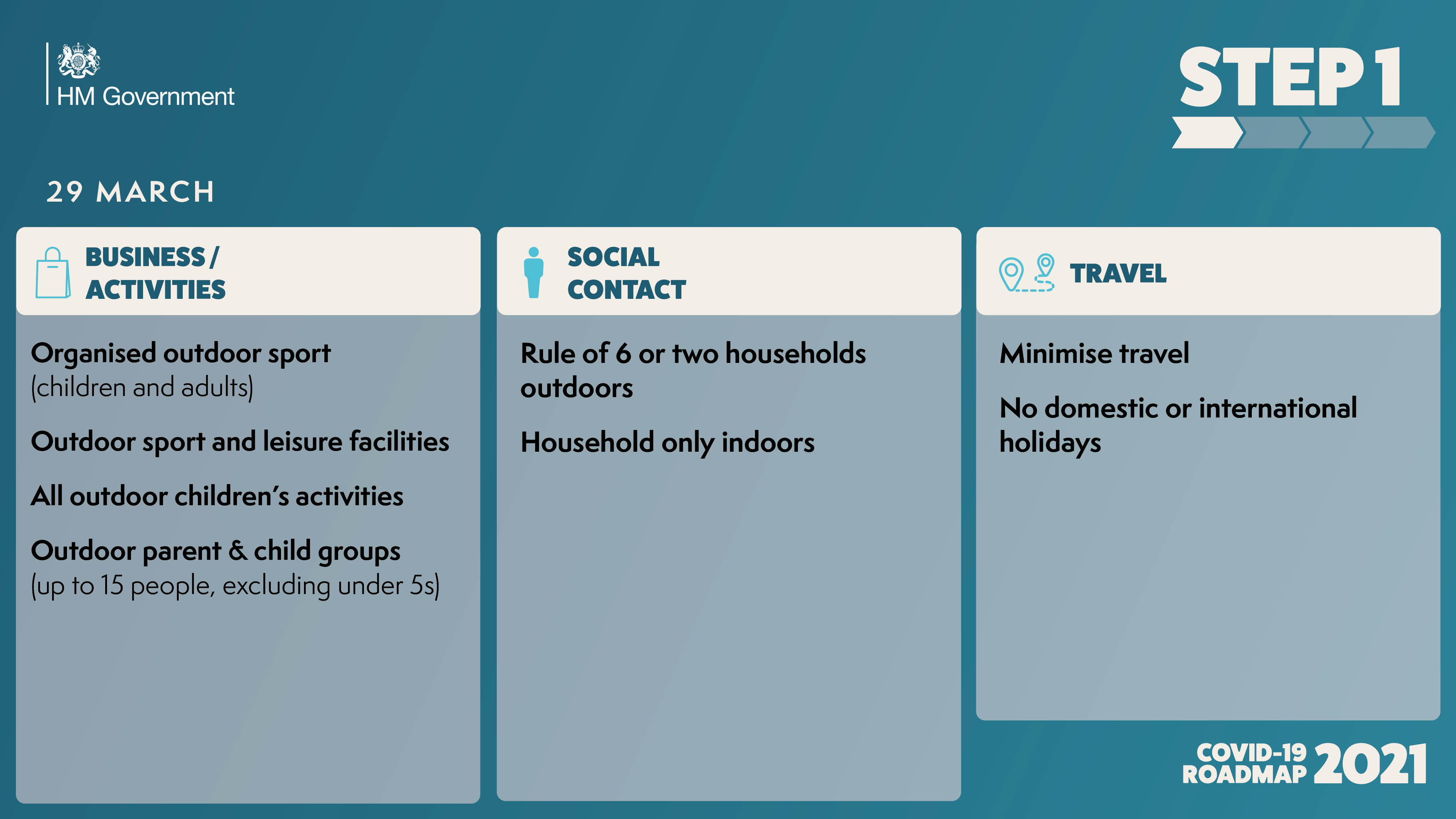 29 Mar 2021: Step 1b: (School hols) Rule of 6 outdoors.