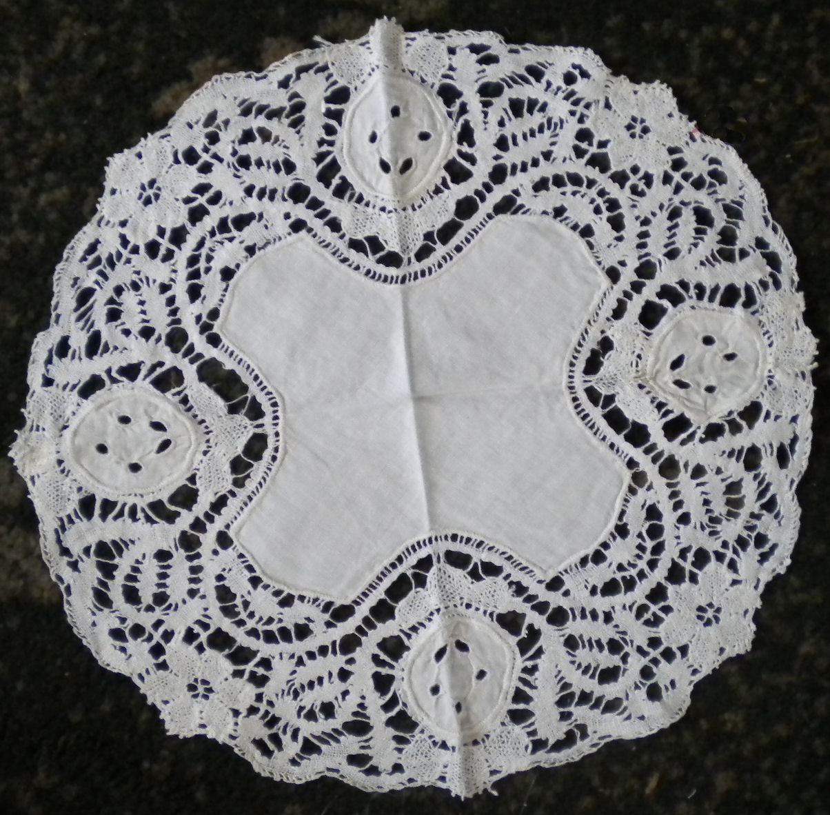 Bedfordshire matThere are half stitch flowers with gimps round, and cloth stitch areas. Plaits with picots join things. There are circles of fabric sewn into the body of the lace edging. This mat is similar to this one. This piece is too big to fit in my scanner (which is how I am reproducing the lace) so I can only show part of it on the right. The entire piece is photographed below to show its shape. | ![]() |