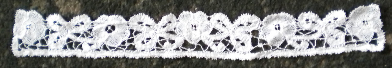 Honiton lace - cuffSome of the motifs in this cuff are roses. The others look a little like shamrocks, but they could be rose leaves. The motifs are worked in cloth stitch and half stitch. The centres have little tallies, which are joined with a single twisted pair. The motifs are joined with legs with picots, and small patches of half stitch. A cloth stitch trail runs along the bottom edge. This cuff is too big to fit in my scanner (which is how I am reproducing the lace) so I can only show about half of it above (but the pattern is reflected for the other half). The entire cuff is photographed below to show its shape. | ![]() |