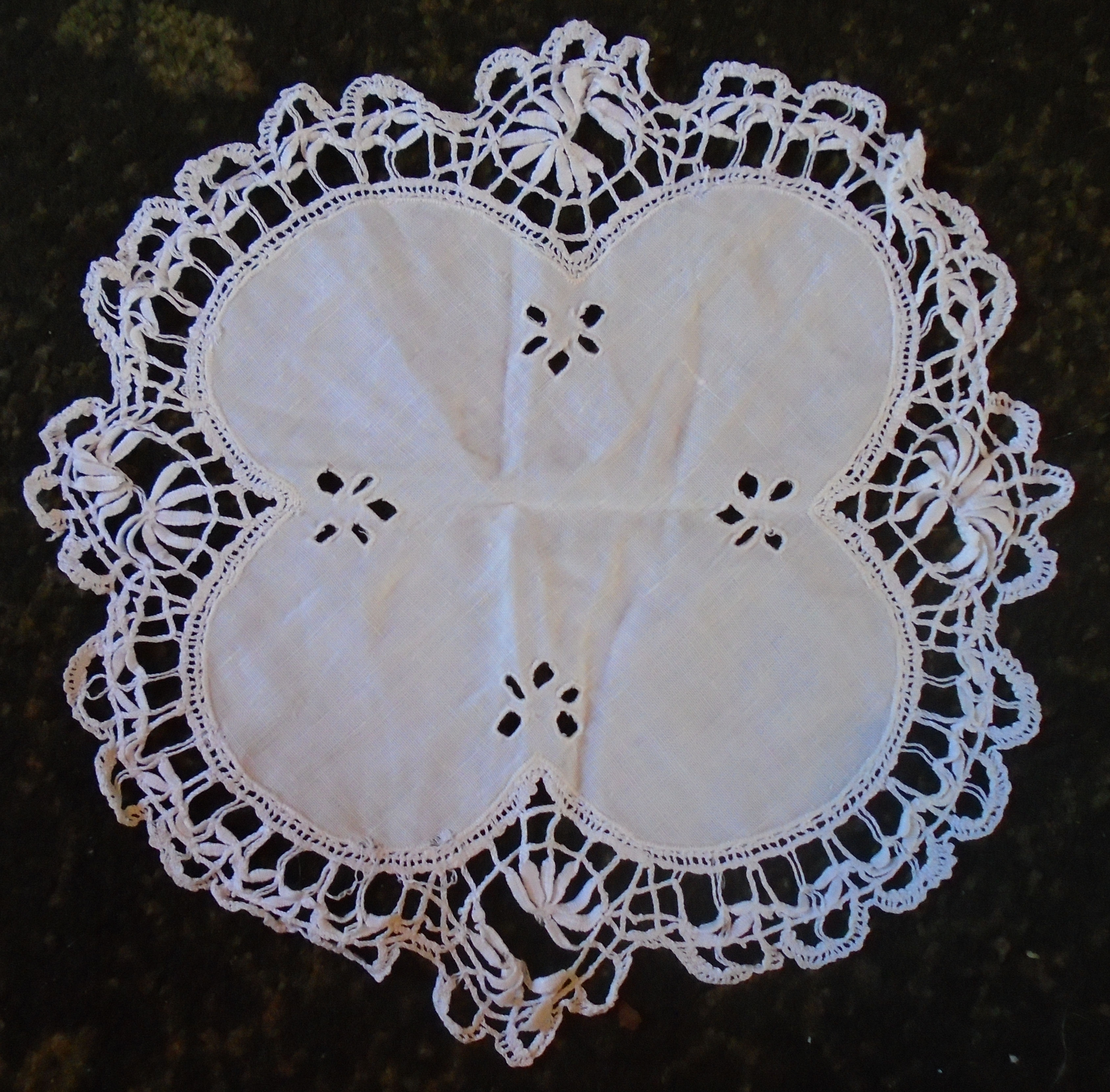 Cluny lace - matThere are tallies and a pattern of plaits. The headside is French fan headside (or Cluny edge). The tallies making the flowers are obviously worked in two parts, and the stitch joining them has mostly come apart! This piece is too big to fit in my scanner (which is how I am reproducing the lace) so I can only show pieces of it on the right. The entire piece is photographed below to show its shape. | ![]() |