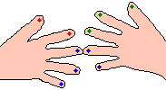 Then you multiply the fingers on the left hand above the touching ones with the fingers on the right hand above the touching ones. These are the units. Here there are two fingers on the left (marked red), and three fingers on the right (marked green), so that makes 2x3 = 6. Add this to the 50 you've already got, and that makes 56. |