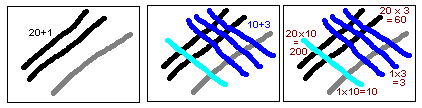 3. Where the lines cross, count the intersections and work out the sum. So 20 x 10 is 200, and 20 x 3 is 60, and 1 x 10 is 10, and 1 x 3 is 3.