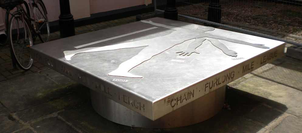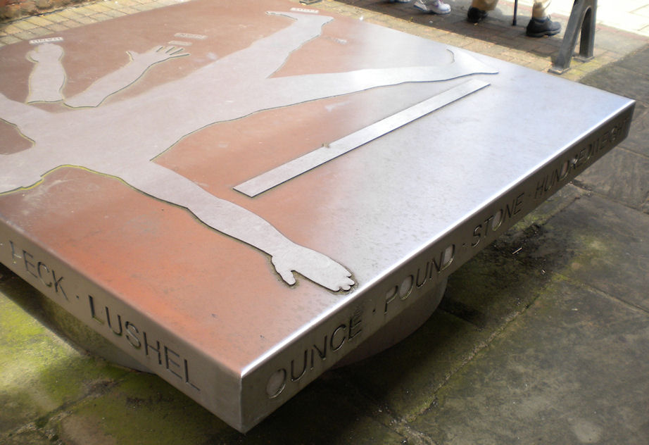 This is part of the Town Trail in Beverley, East Yorkshire, showing Imperial units of length, volume and weight. It is modern.