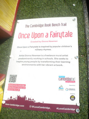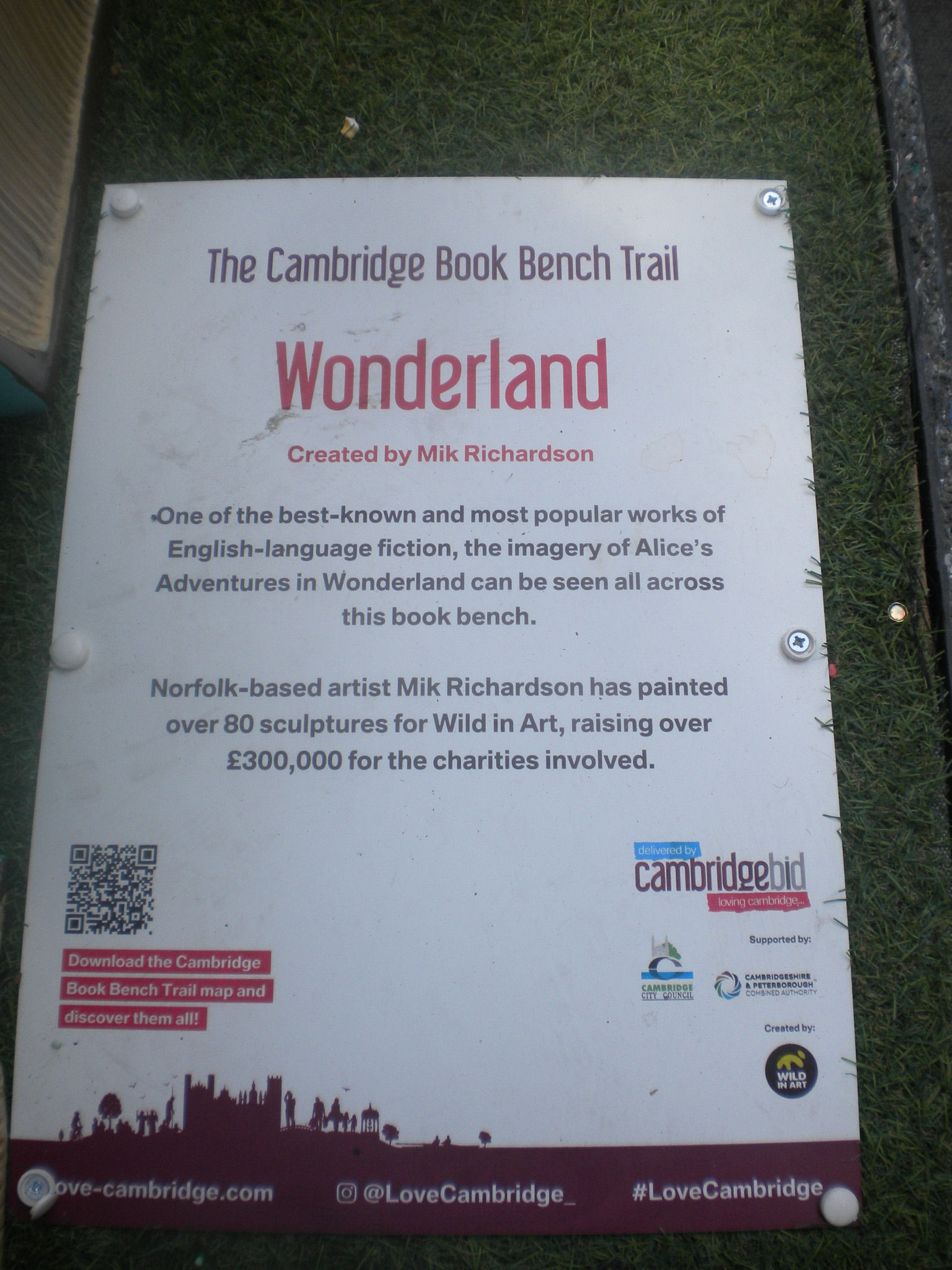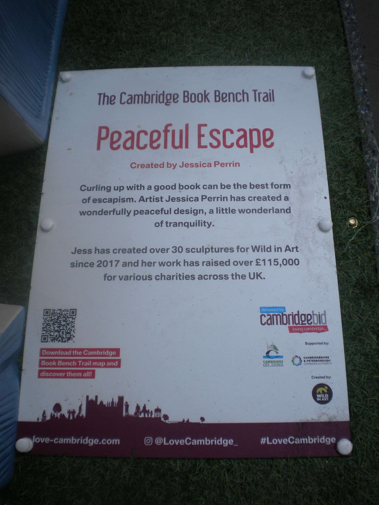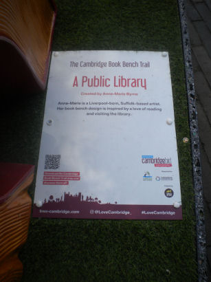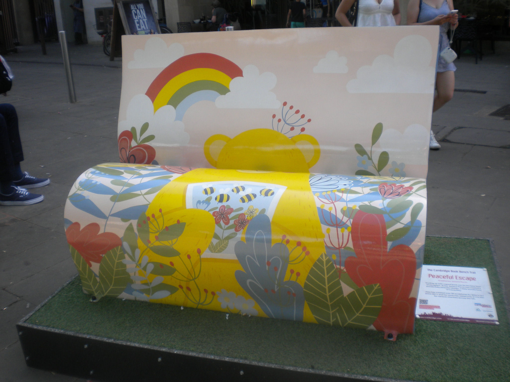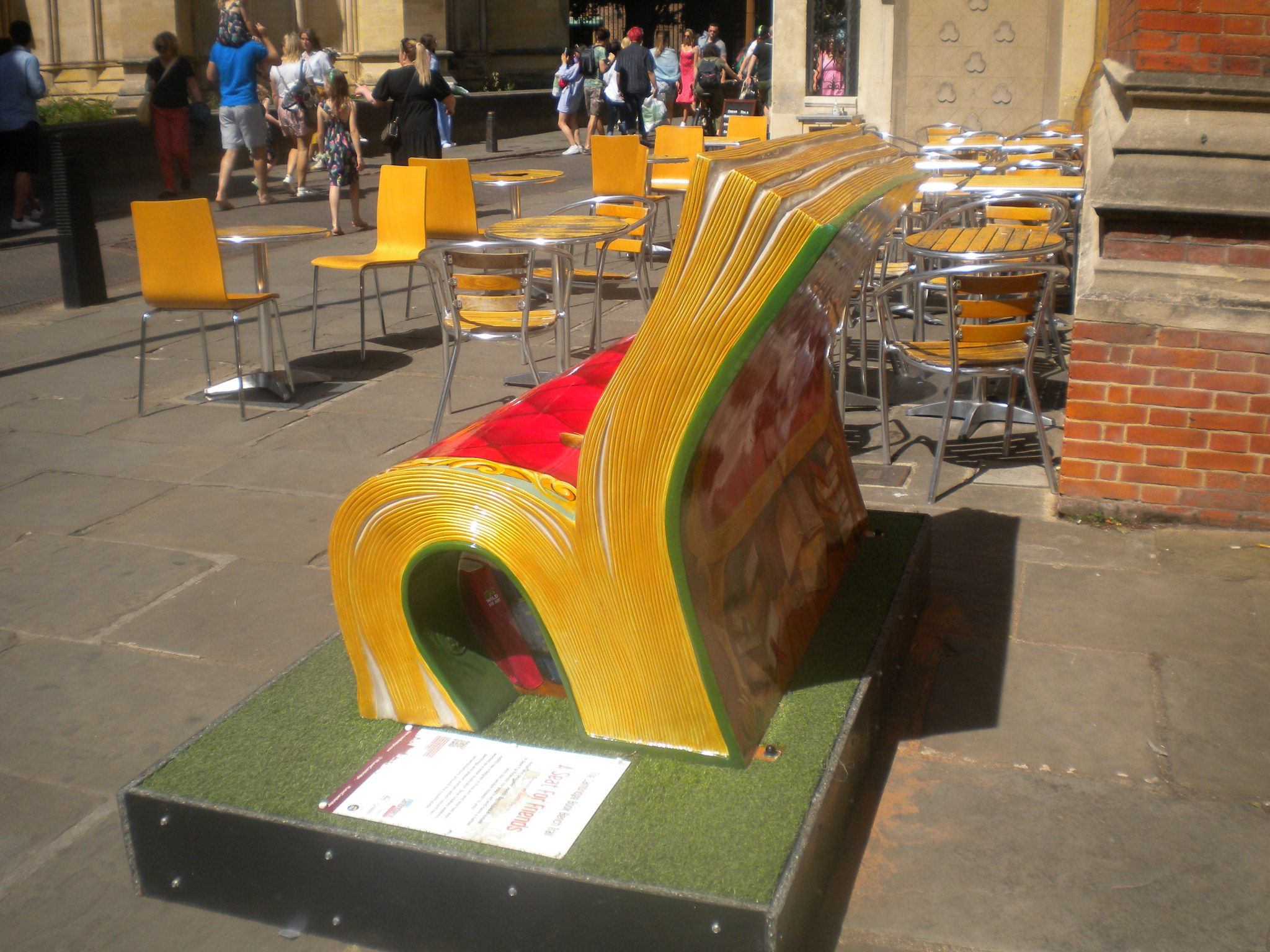 In summer 2022, a number of decorated book benches appeared on the streets of Cambridge. I assume that these will be temporary, like the cows. The "blurb" says "This summer Cambridge BID are working with Wild in Art to install 12 Book Bench sculptures across the city, all individually designed by UK artists. You will find them in the historic core, shopping centres, train station and in the parks and open spaces.