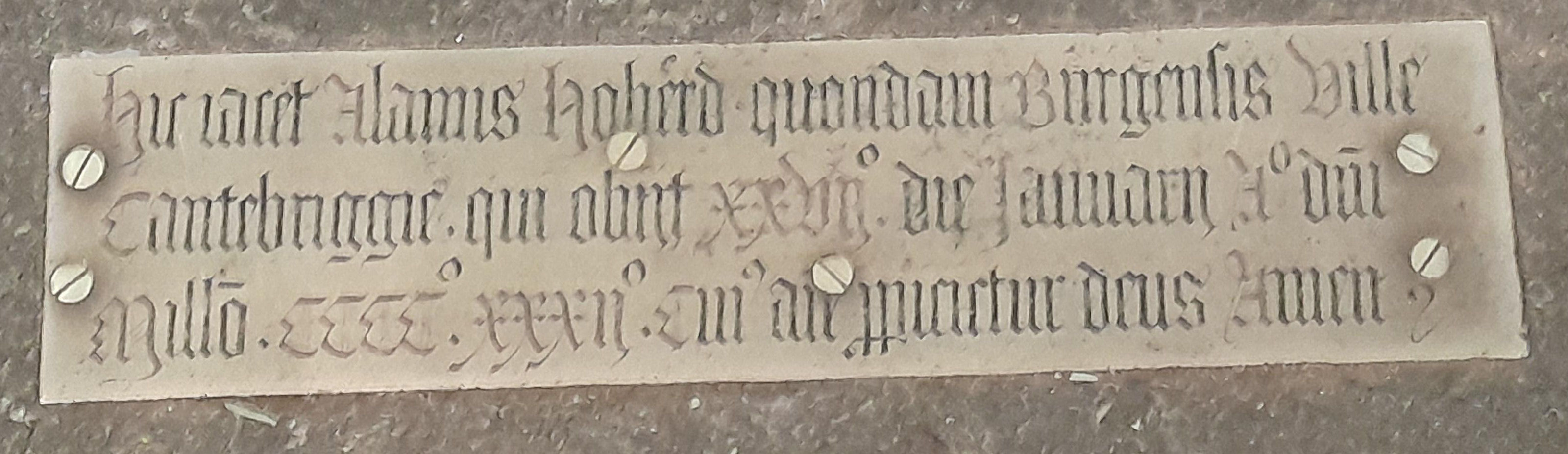 However, there is an early brass memorial, just by the font. The translation is "Here lies Alamis Hoherd (?) formerly Burgess of Town of Cantebriggie, who died 27th of January the year of our Lord CCCCXXXII (1432)" (although I'm not quite certain of the name).