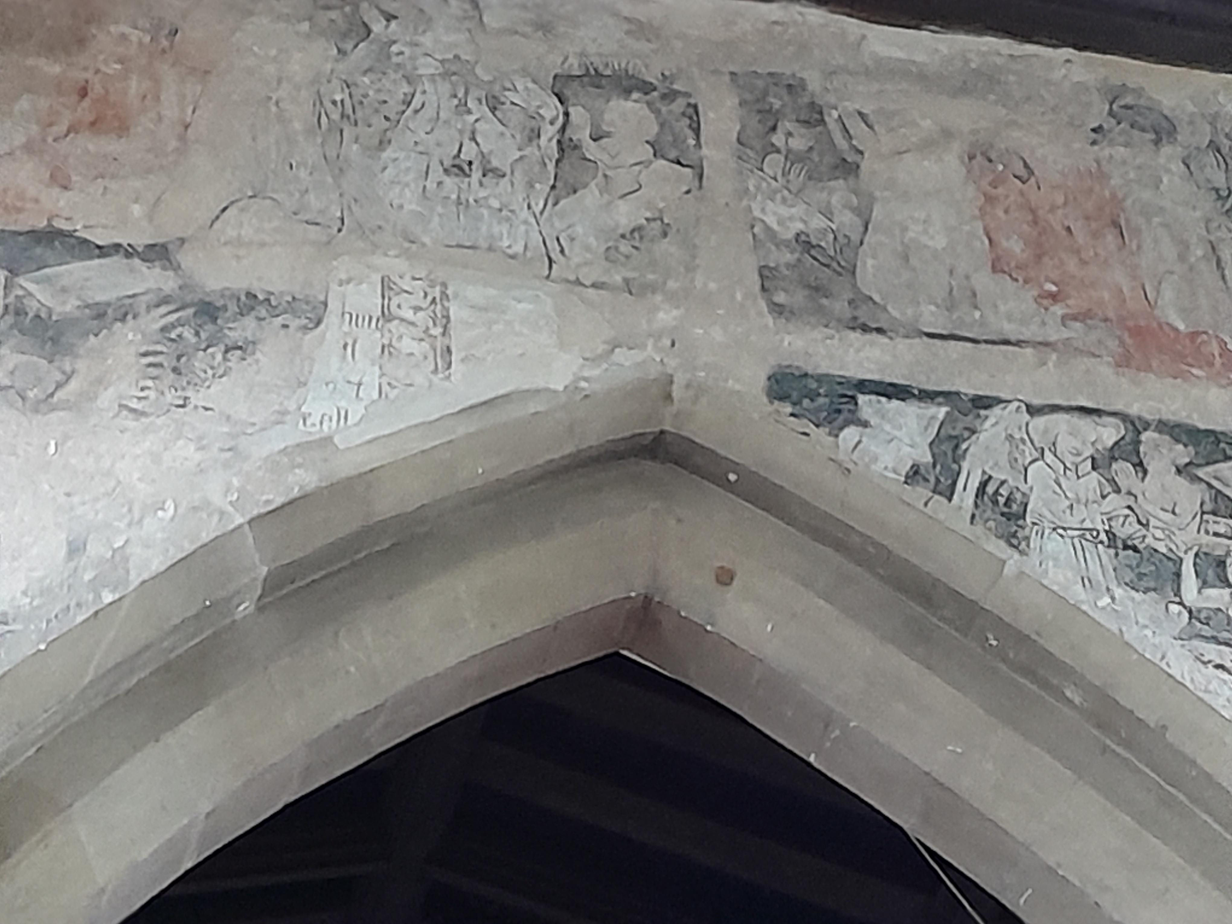 Inside the church there is a well preserved medieval wall painting of the Last Judgement. These Doom Paintings were common in medieval churches, but they considered to be 'graven images' during the Reformation. This picture was painted over, which preserved it. While it is faded and incomplete, you can still make out saints and demons. On the left of the arch there is a picture of the new Jerusalem, with its towers and walls, and the souls of the righteous are rising to everlasting heaven. On the right of the arch a number of devils are pulling people from their graves (including kings, popes and monks) and dragging them off to punishment. There is even a picture of a devil wearing reading glasses and ticking off names on his list. Click here for more information and some more pictures.