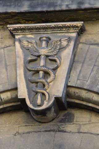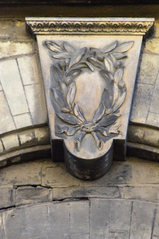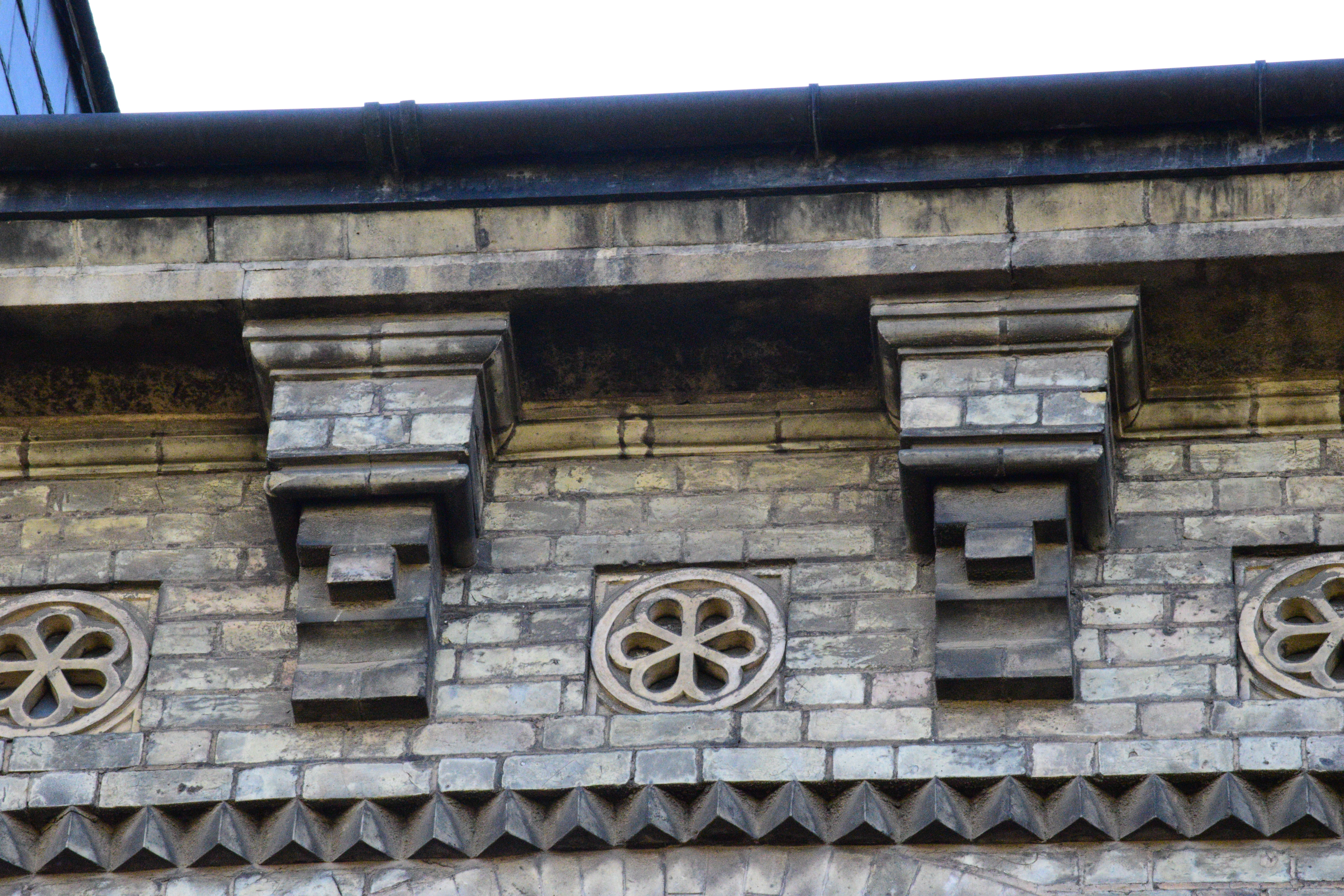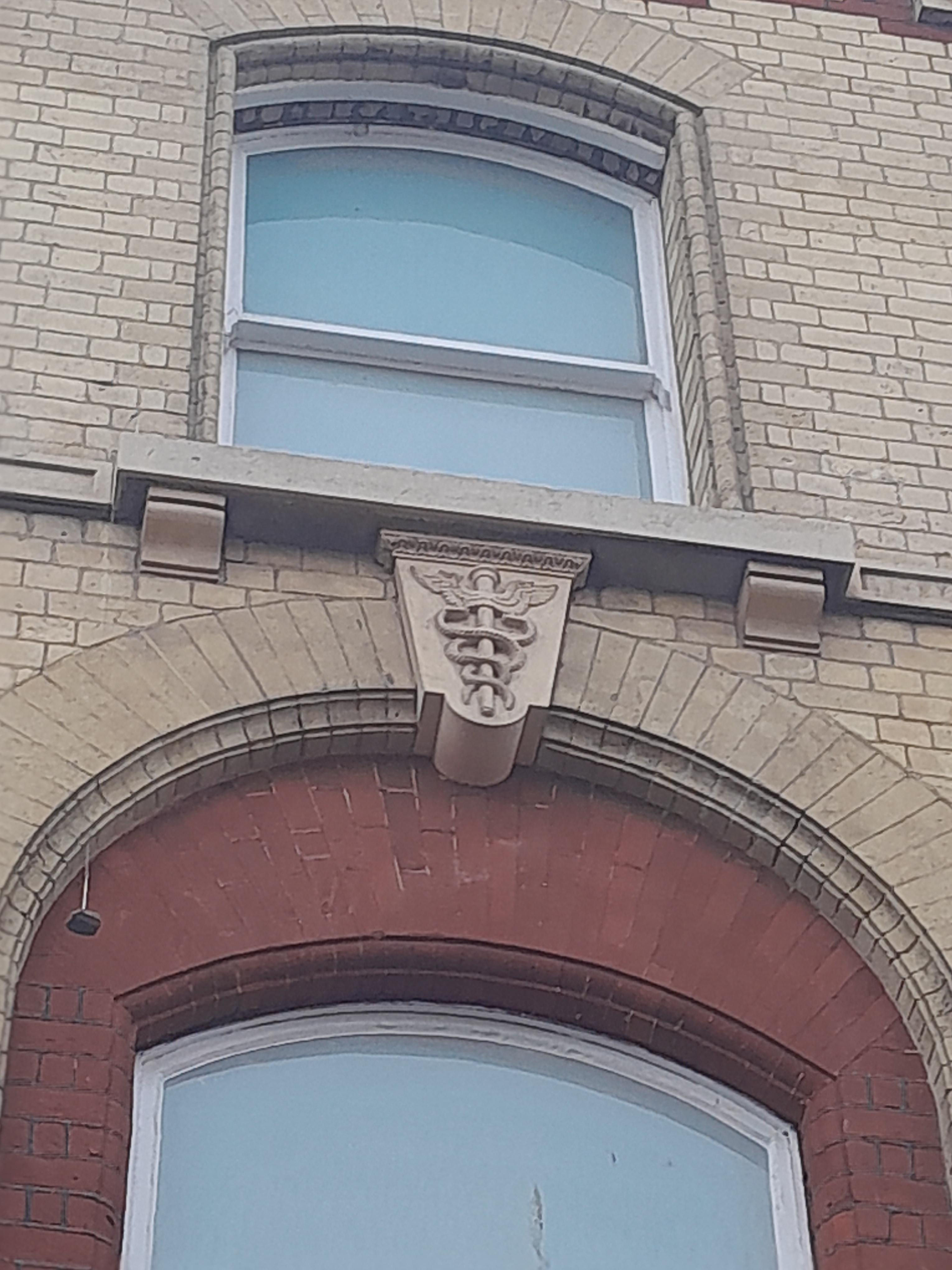 The Grand Arcade archaeological report of 2019 notes that this frontage was combined behind a single facade c.1866-9 when it was occupied by chemist Henry James Church. There are three symbols on the keystones of the first floor window arches. The southernmost is a foliage decoration with a stylized lotus flower at the top; in the centre is Caduceus, two snakes entwined around the winged staff of Hermes, generally taken to be a symbol of the medical profession; the northernmost is a bunch of grapes flanked by vine tendrils.