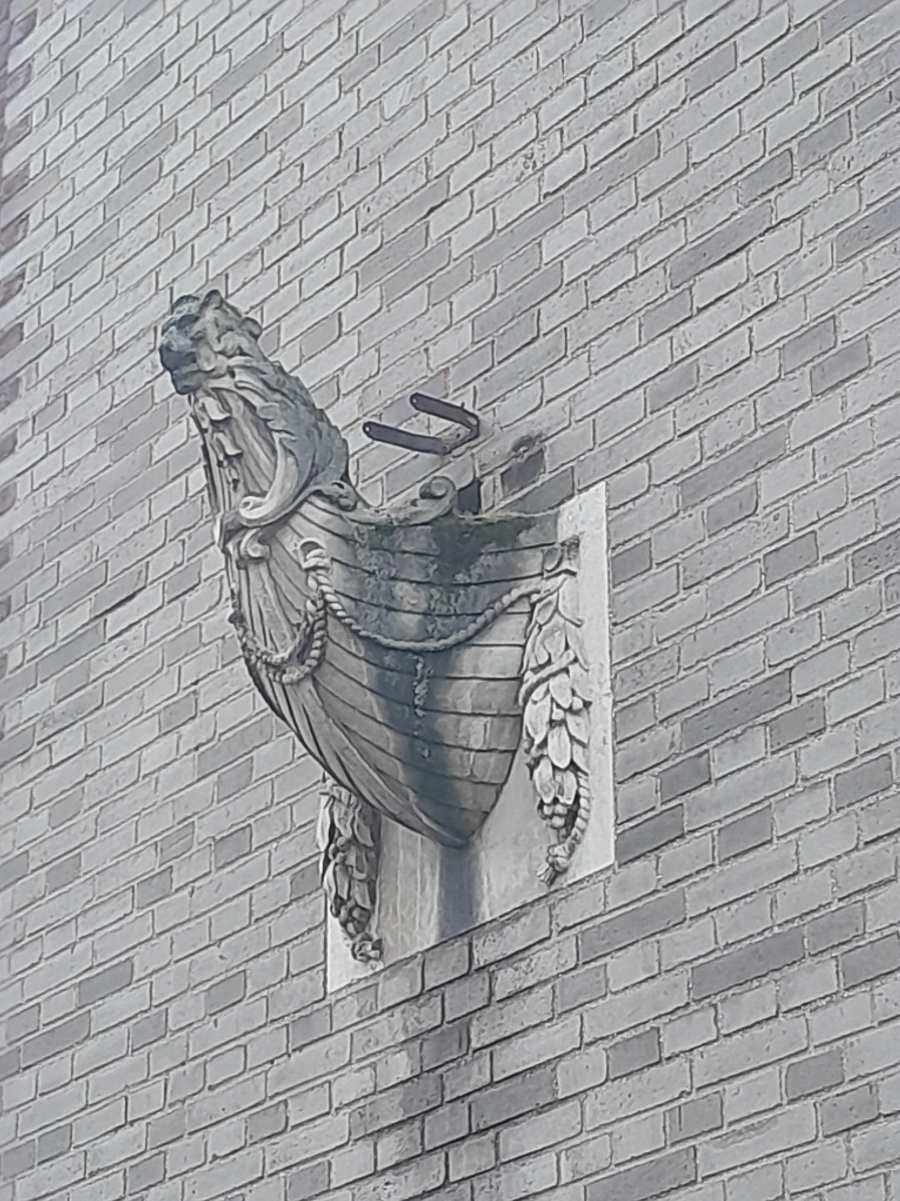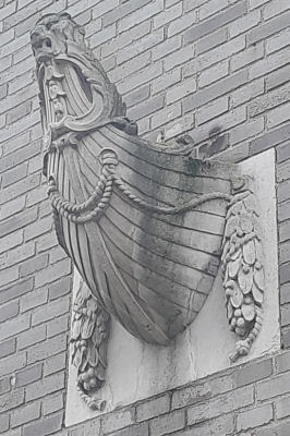 On the Hobson Street side, there is a feature of ship ends set into the wall. The "Rostra" was a large platform built in ancient Rome. It was called that because it was decorated with "rostra" (a form of bow on naval ships) from captured ships. I wonder if this is supposed to be a similar effect, as they flank the balconey.
