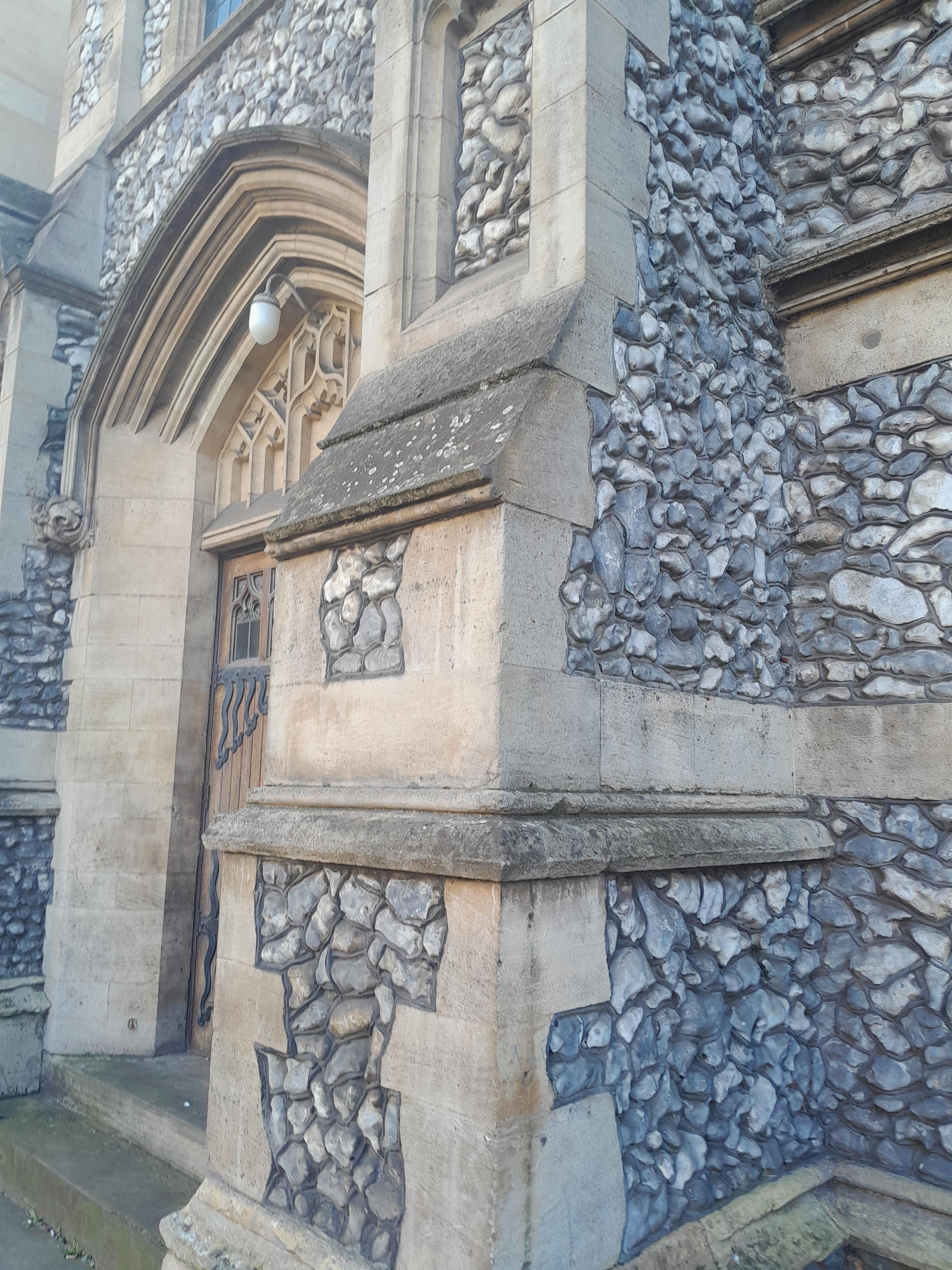 Henry Martyn Hall (grade II) is also made of pebbles and other stone pieces. The listing says flint, but I'm not sure! Henry Martyn Hall was built in 1887. It is in Market Street.
