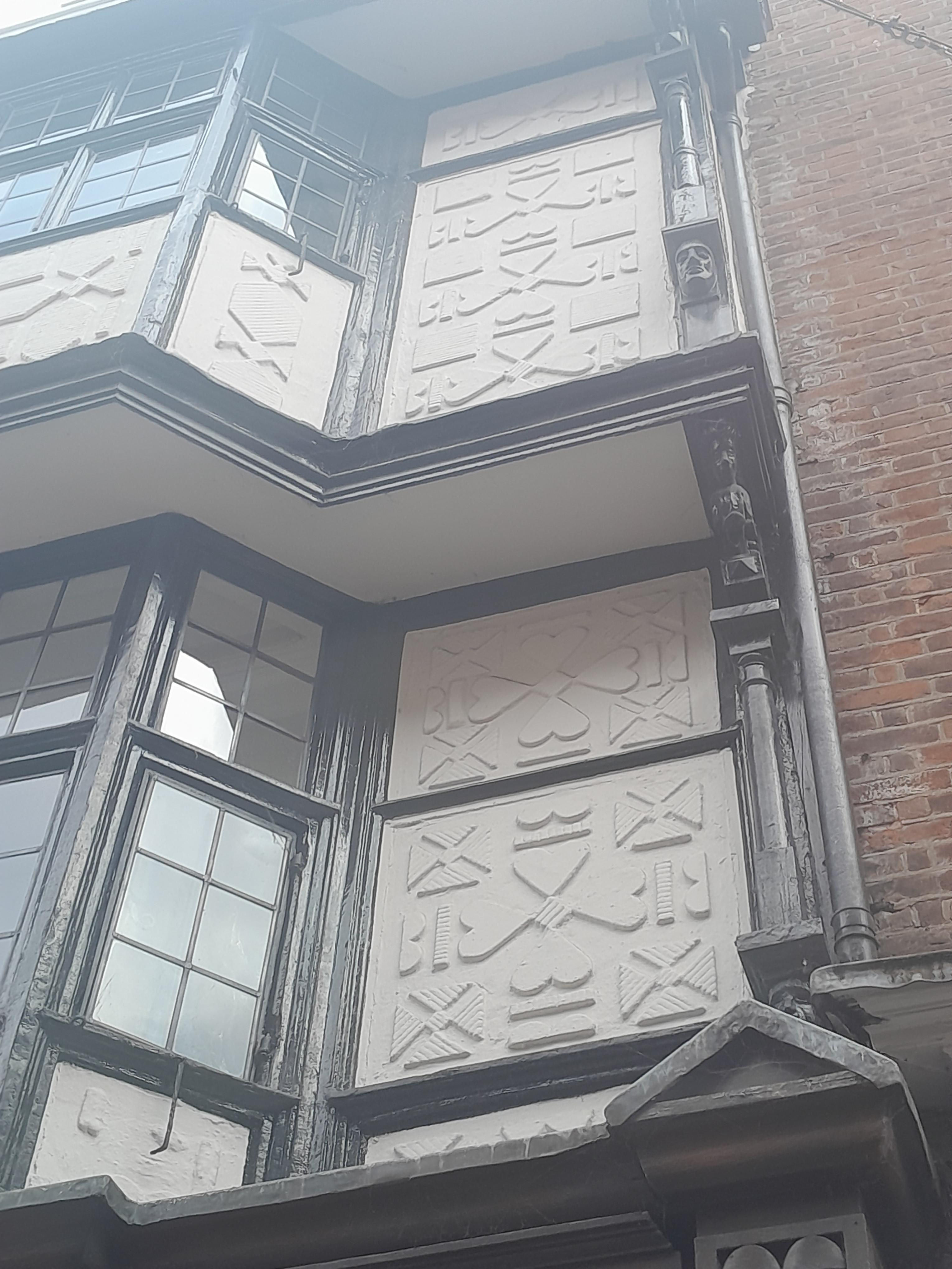 25 Magdalene Street (grade II) is early 17C. It has grotesques supporting the jetties. There is a local story that these used to advertise a brothel! However, it is more likely that these grotesques were a protection against witchcraft.