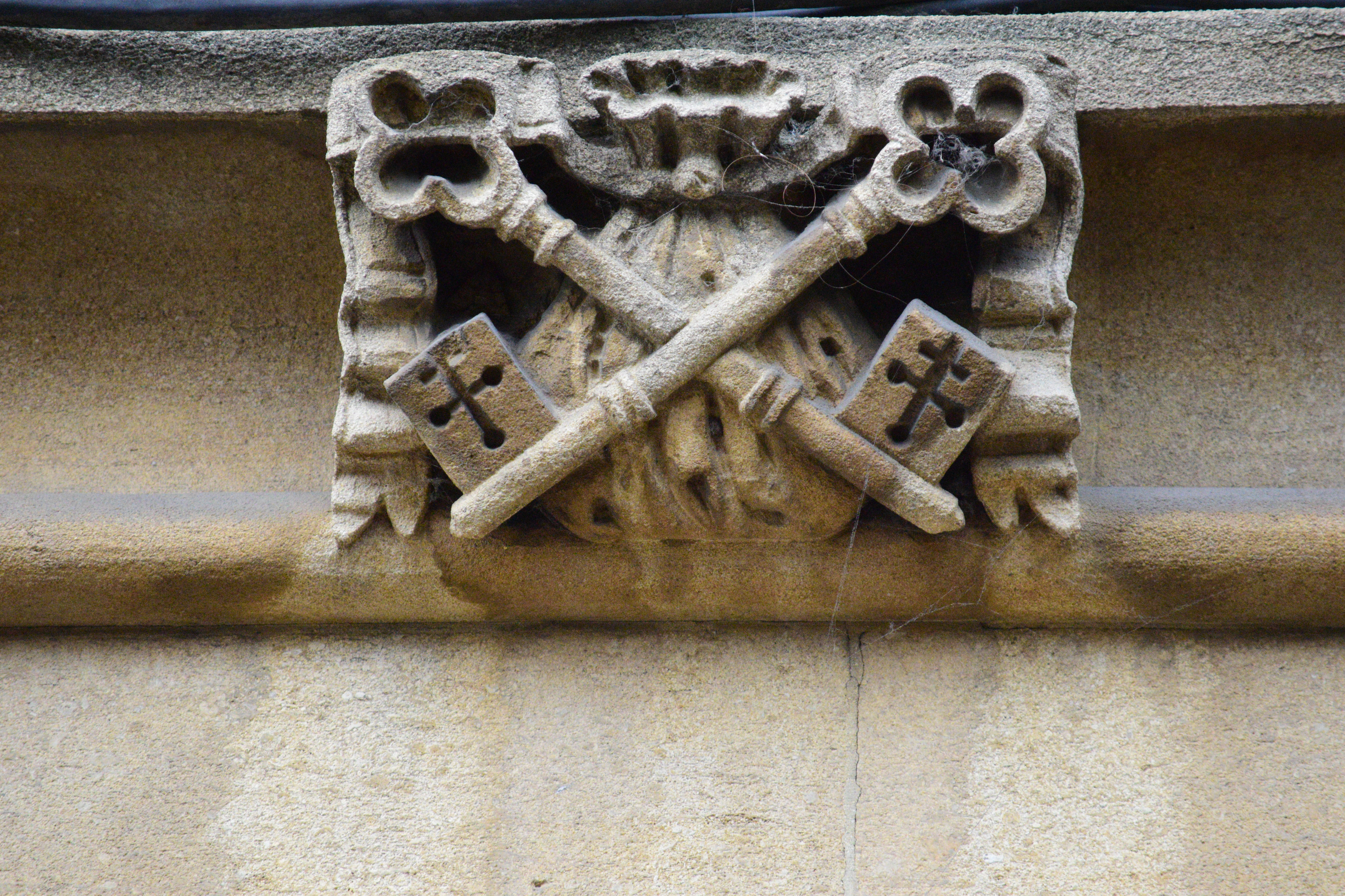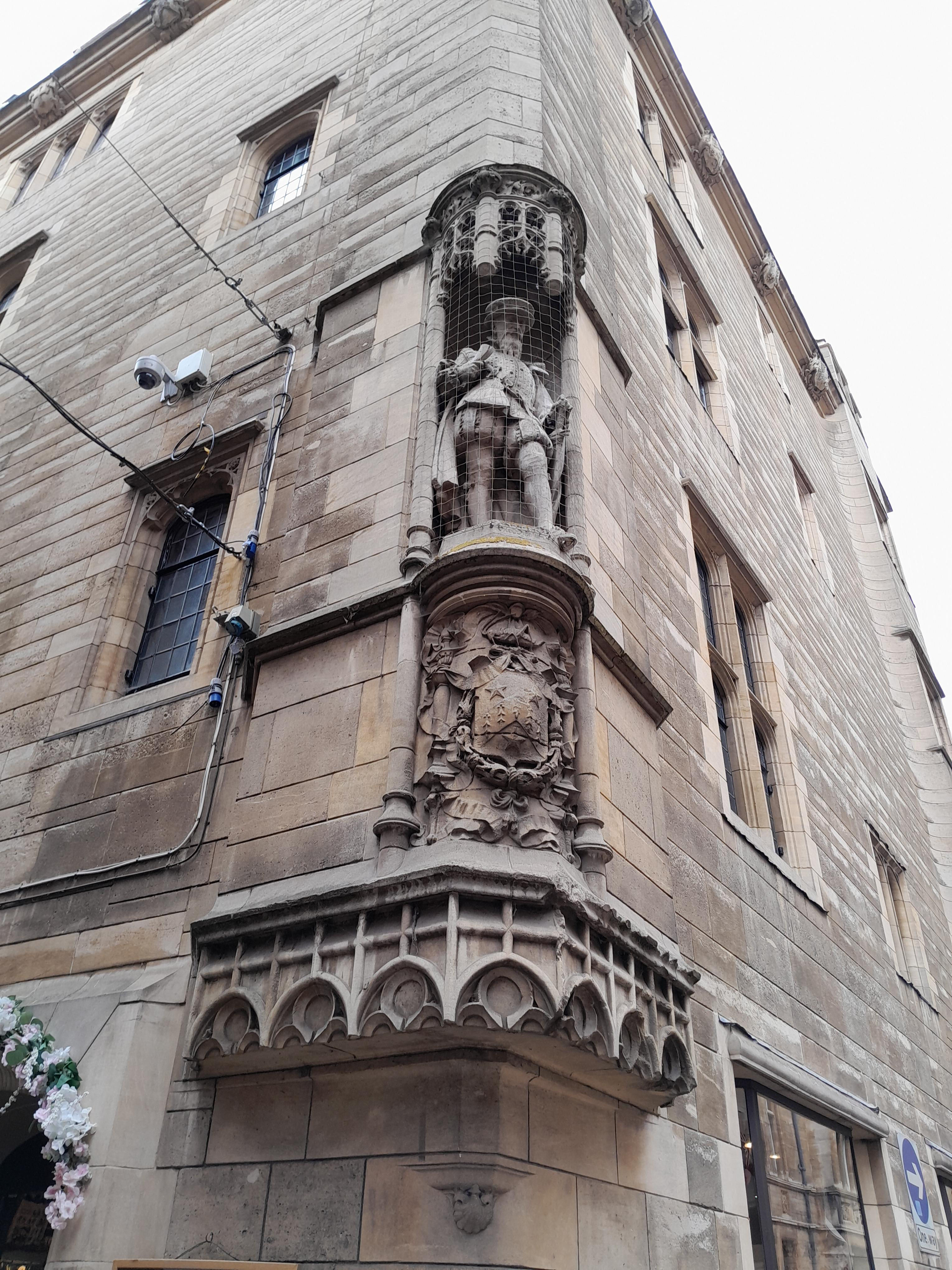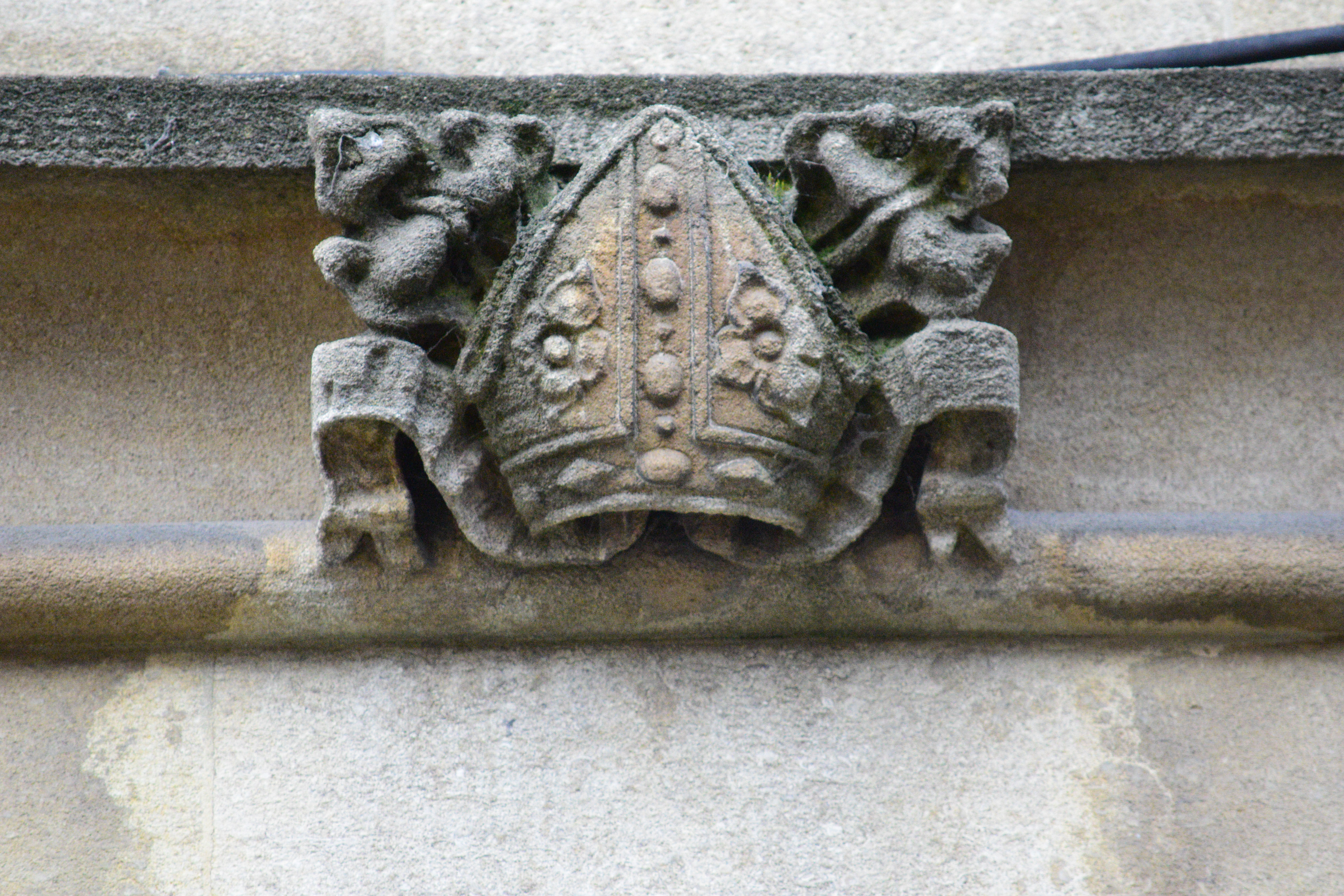 The building was built by Gonville and Caius College in 1888. Edmund Gonville founded Gonville Hall in 1348. When he died in 1351, the Hall’s finances were shaky, and his executor William Bateman, Bishop of Norwich, stepped in to move the College a short distance to its present site and make provision for its endowment. The College entered a period of some decline. In 1557, rescue came in the shape of former student and Fellow John Keys. As was common in Elizabethan times, Keys spelled his name in many different ways, one of which was Caius. Perhaps the three figures also on this building are these three men.