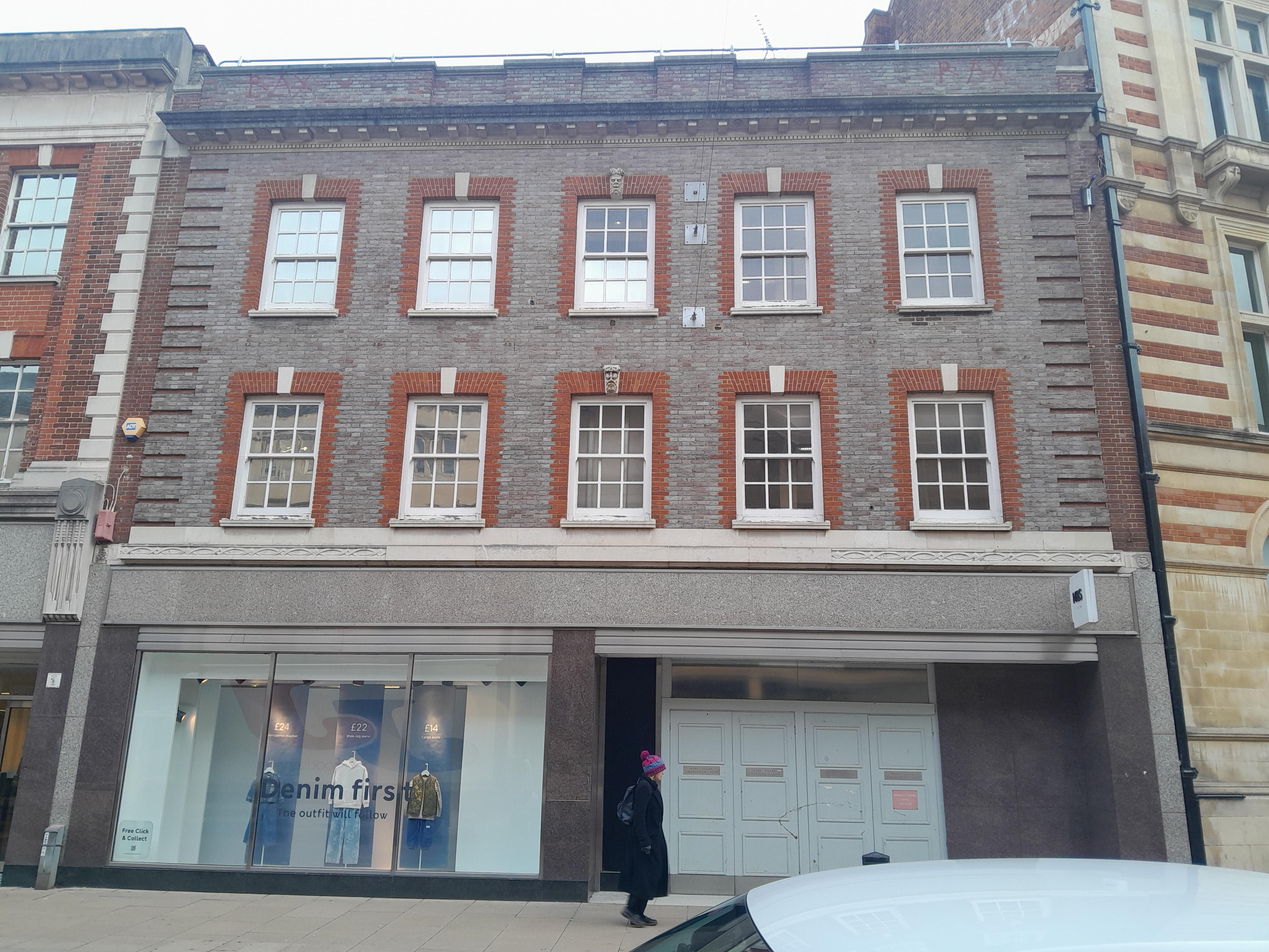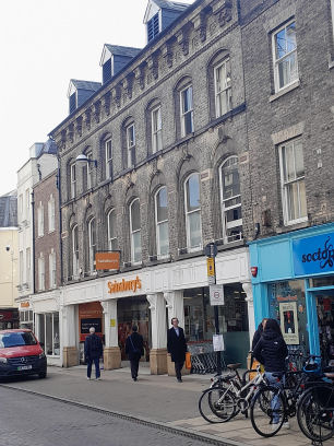 43 Sidney Street is now Sainsburys. There are various designs above the first floor windows, plus other features. In 1889, this house was owned by William P Spalding, stationer, publisher & bookseller, who created Spaldings Guides to Cambridge.