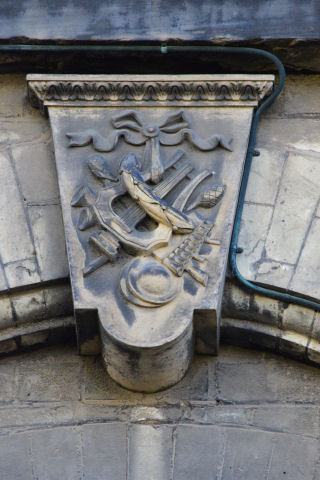 10 Trinity Street is listed grade II. It was built in the early 1880's for a firm of solicitors. Over the door it has this feature. The hourglass indicates that the subject matter of the inscription is Time. The writing says "PRAETERITUM CORRIGE" (Correct the past), "PRAESENS REGE" (Control the present), "FUTURUM CERNE" (Perceive the future), which is rather a chilling motto for solicitors! The original is part of a short epigram by the 16th century Bavarian jurist called Nicolaus Reusner.