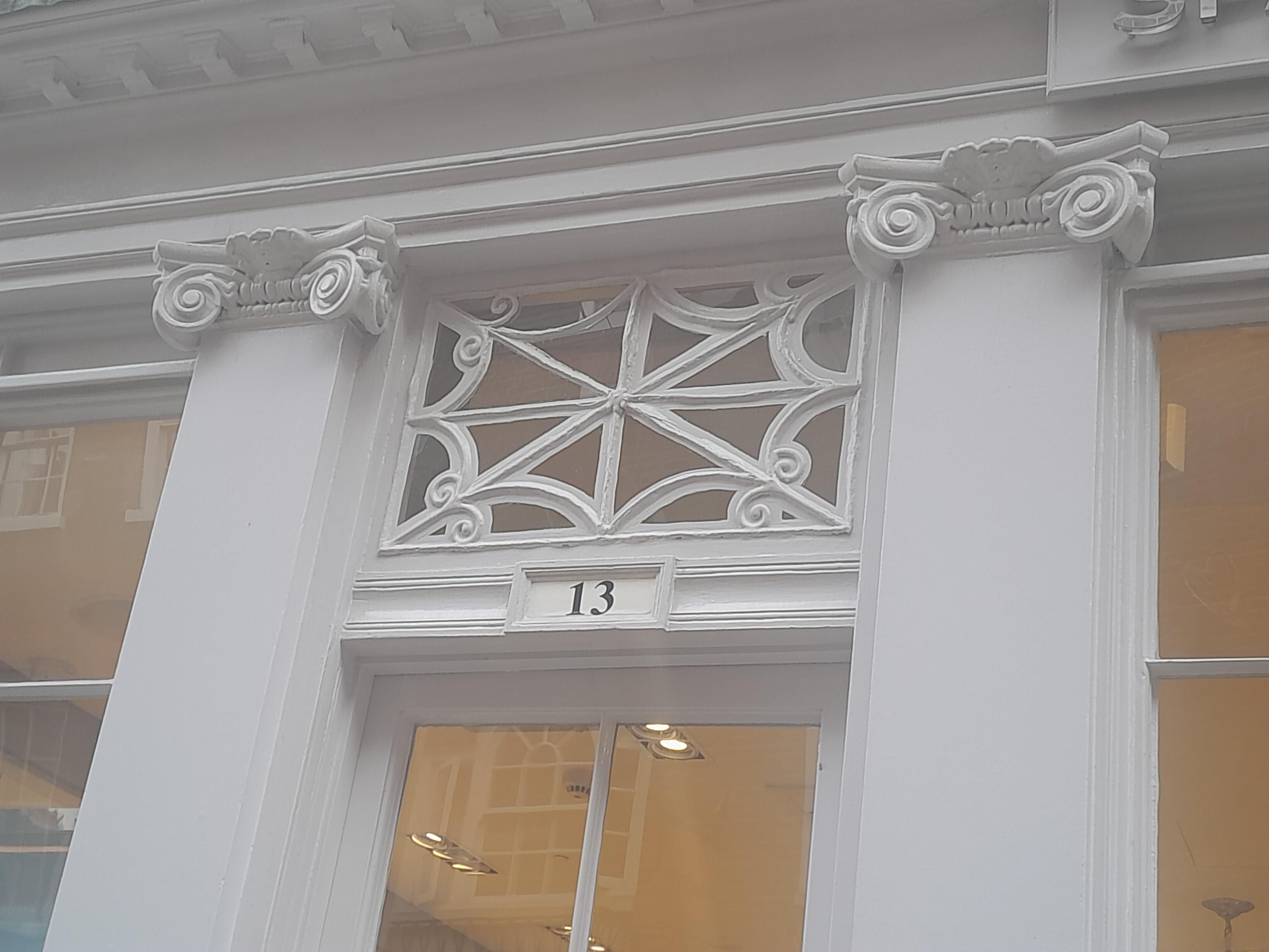 13 Trinity Street is listed grade II*. It was built in the late 18C, with a shop front of early 19c. There is a window pattern over the door.