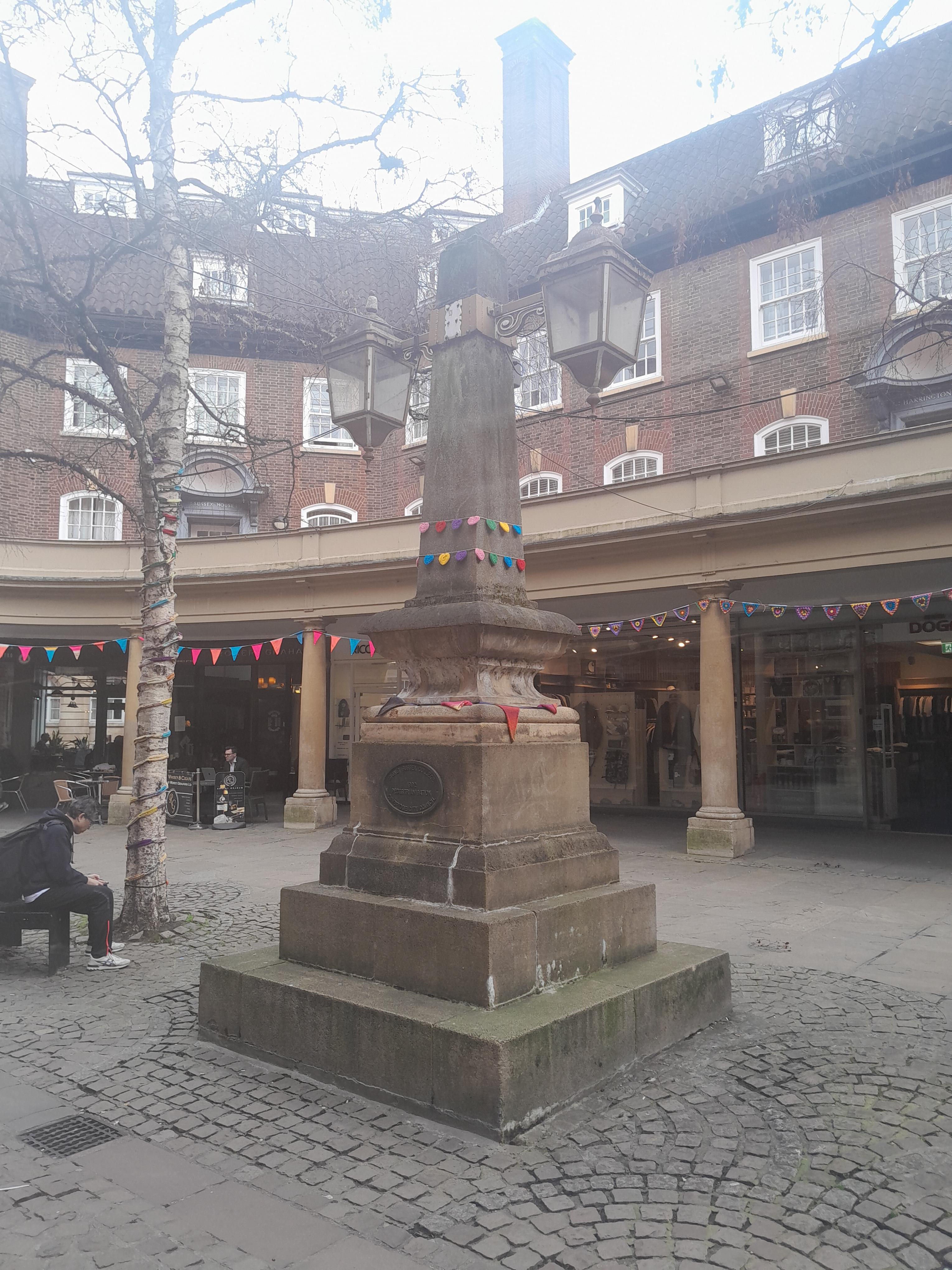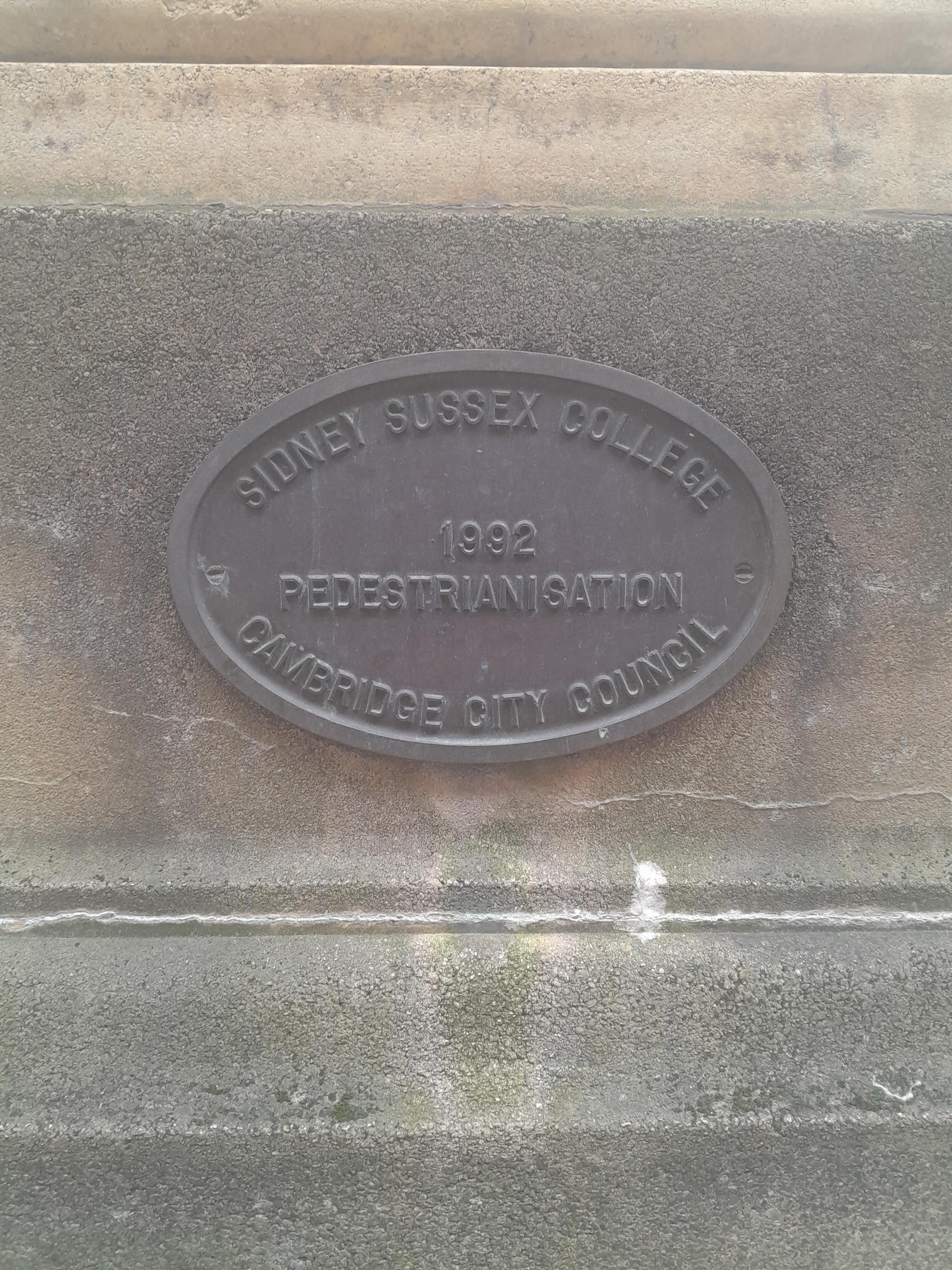 There is a grand lamp stand in the middle of Sussex Street, looking like an obelisk. Sidney Sussex and Cambridge City Council decided to fasten this plaque on it saying "Sidney Sussex College - 1992 - Pedestrianisation - Cambridge City Council".