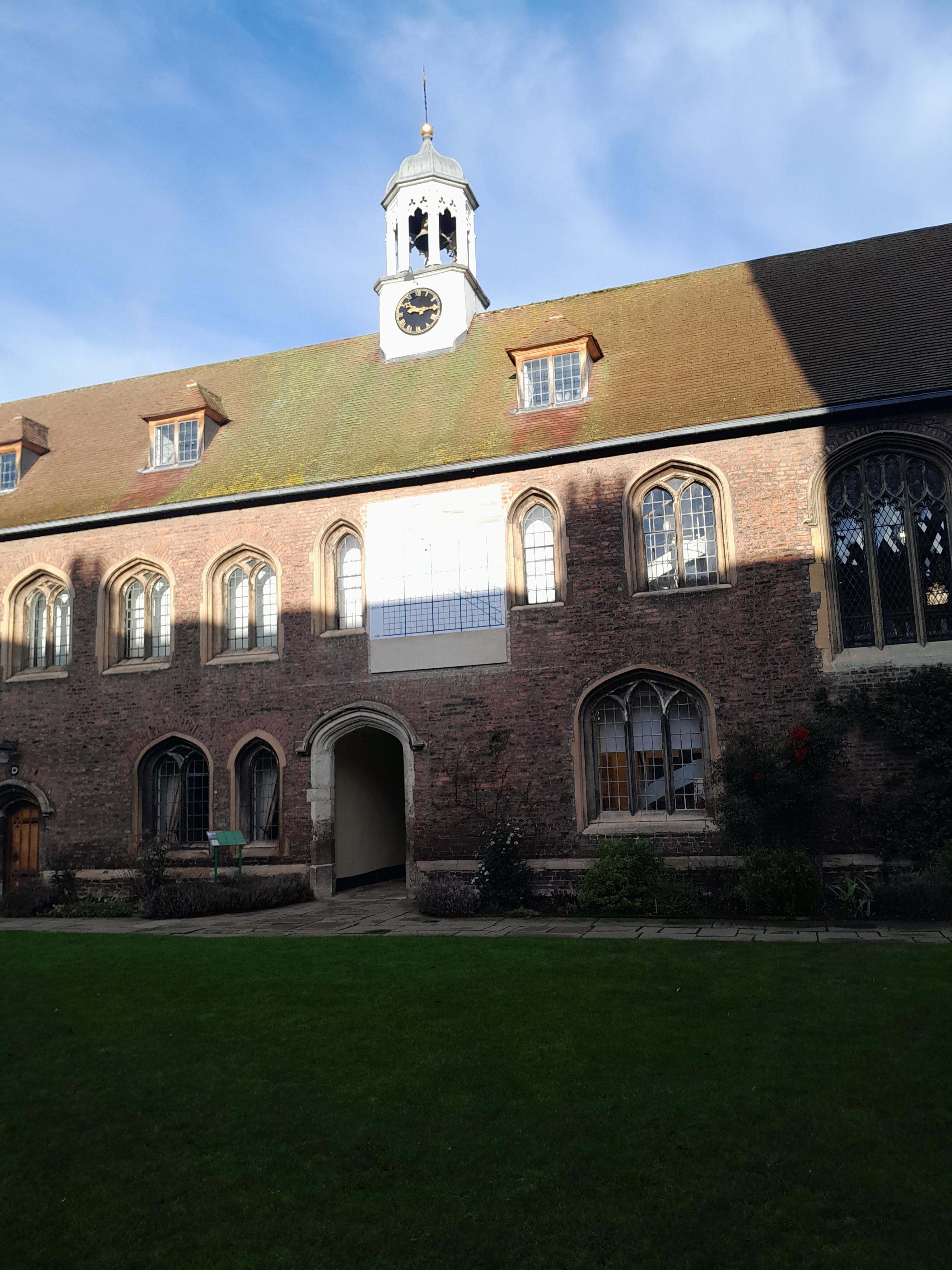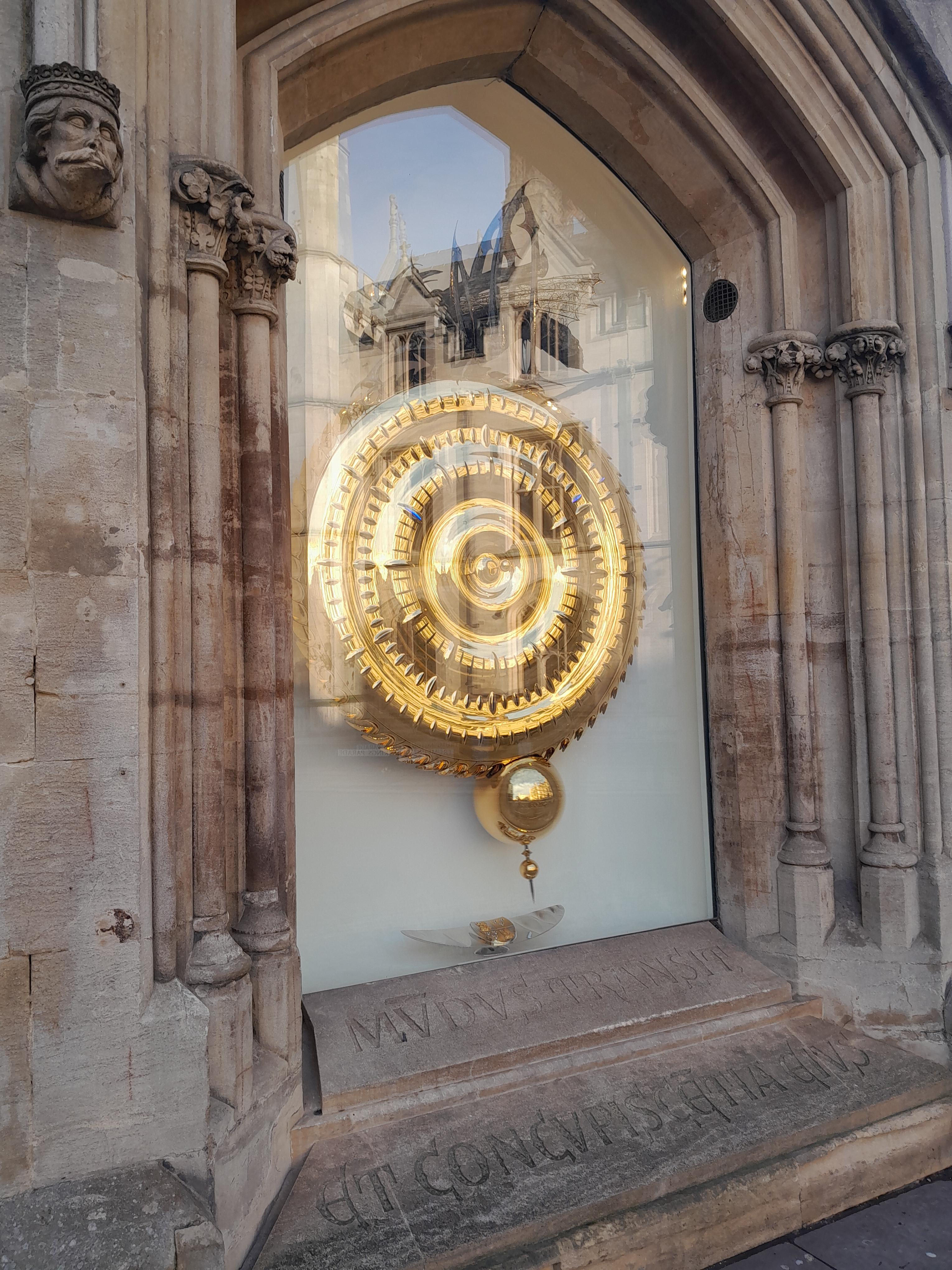 This clock is inside Trinity Great Court, and unfortunately you can see it properly from the public viewing point (you can just see the edge, on the right). Trinity charges the casual visitor, and sometimes does not allow entrance at all.