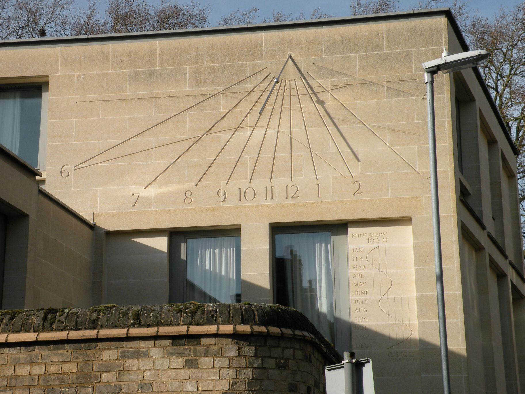 Beyond the tennis courts, there are some flat stones laid out in the grass (and easy to overlook - they are not the barbecue stones, or the bandstand!) These are the Human Sundial. This needs a person to complete it. You stand on the mark, and your shadow shows the time. Click here for more about it. The Human Sundial is in memory of Vernon McElroy and was unveiled in 2014. Vernon McElroy was a member of the Rotary Club of Cambridge Rutherford, and he conceived the idea of this sundial a year earlier.Newnham Walk is a road leading off Ridley Hall Road, off Sidwick Avenue. It leads to a back gate of Newnham. There is this sundial on a wall. It is a memorial to Margaret Stanier, scientist. She was interested in sundials, and bell ringing (hence the little bell in the gnomon). The sundial looks a little odd. I took this photo at 2pm, and the line is on the IX line (9). This is the fraction of the daylight period that has elapsed since sunrise. On this sundial, the unit of time used is one-twelfth of the period from sunrise to sunset. Such units are termed "hours", but they are clearly longer in summer than in winter so they are known as unequal-hours. Click here for an explanation.