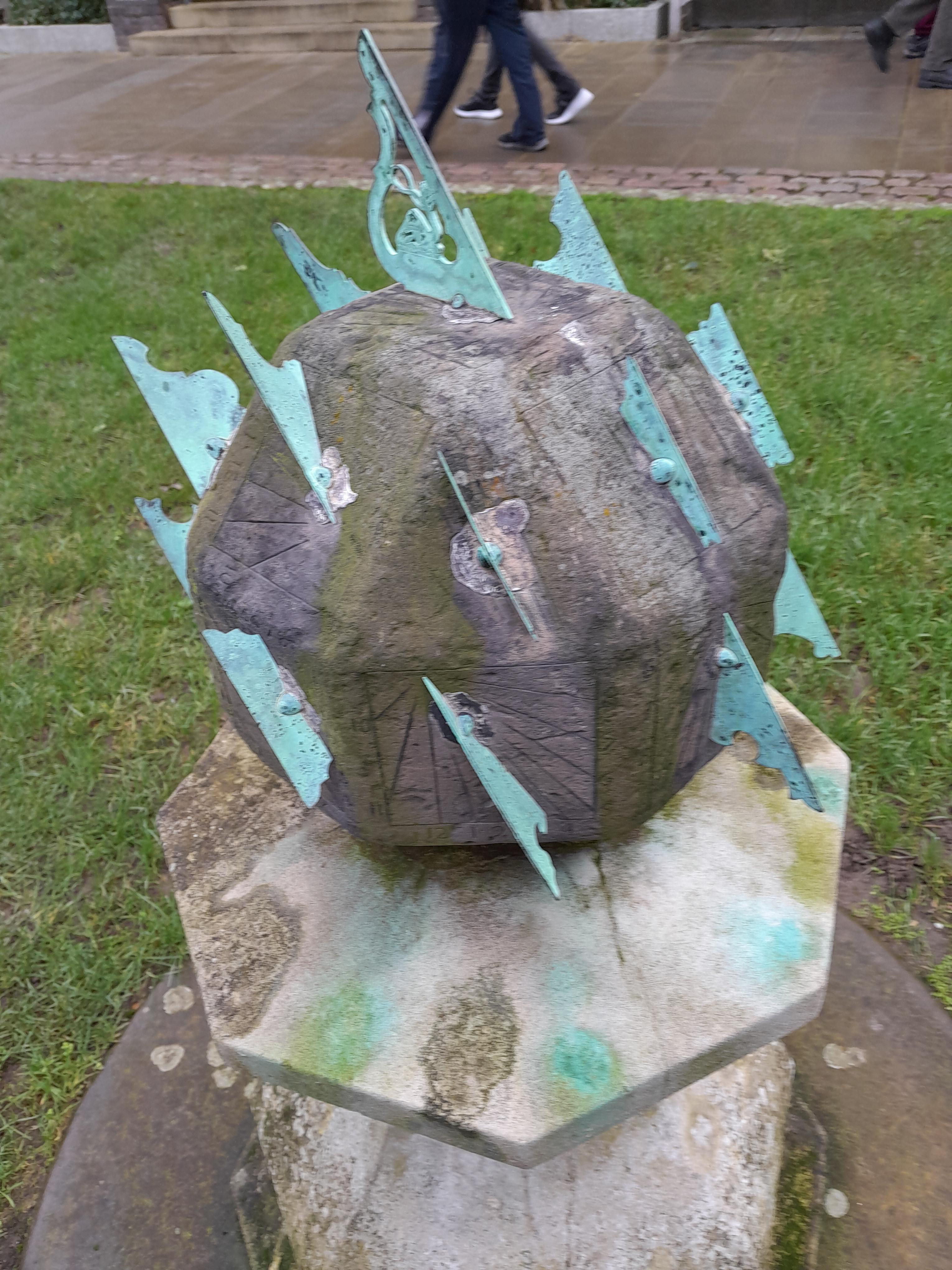 This sundial is within Queens College. You have to pay to enter, so this is an exception to my "public view only" rule. Click here for a history of the dial, and click here for how to read it. Unfortunately, part of its history is that it's being repaired at the moment. I've been given this explanation of the picture above: "This is a picture of the current stage of calibration of the flatness (or otherwise) of the new stone backing to a future restored sundial. It is essentially large-scale graph paper. On the graph paper are drawn the computed lines taken by the shadow of a hypothetical sun on the dates of the zodiac changes (winter solstice at the top), if the stone backing were completely flat (which in reality it is not quite). The actual shadow of the sun cast by the ball is being monitored continuously by a camera on the opposite wall, and recorded, which we have been doing for many months. When we have enough data on the divergence between the real sun's shadow on the uneven surface, and the computed lines, then we will be able to paint a sundial image on which the lines have been pre-compensated for the unevenness of the surface on which they are drawn. You can expect to see things start to change towards a restored painted dial sometime after the next Spring Equinox, and before the Summer Solstice."