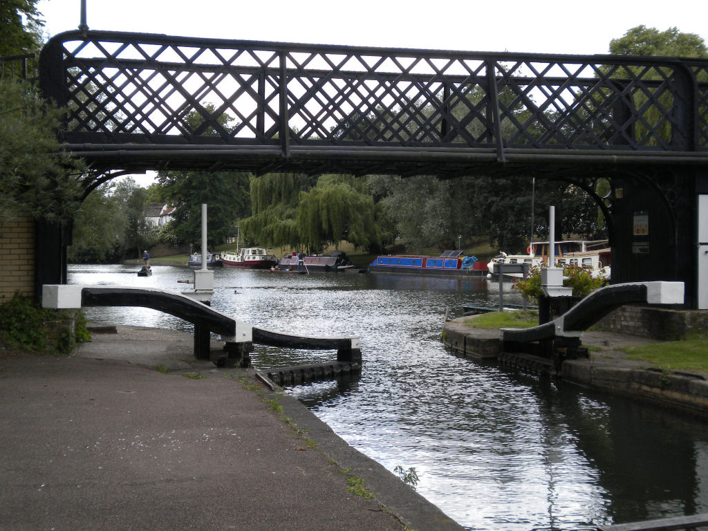 Jesus lock was built in 1836. It divides the river. Downstream there is the lower river, used by the rowing eights and other boats from the college and Town boat houses. Upstream is the middle river, which belongs to the punts. You can just see a punt under the footbridge. There is also a weir, and a footbridge built in 1892.