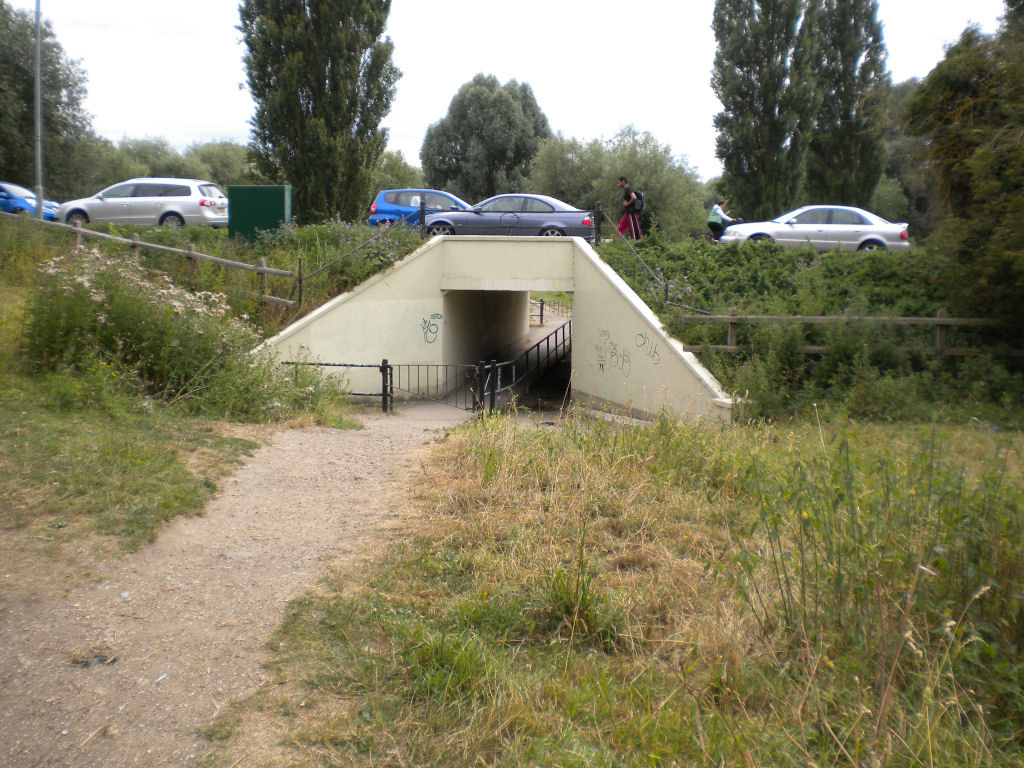 Ahead is one of the main roads of Cambridge, Fen Causeway. A causeway is a raised road through a fen. Another causeway in Cambridge is Maids Causeway. Walk under Fen Causeway through the underpass. |