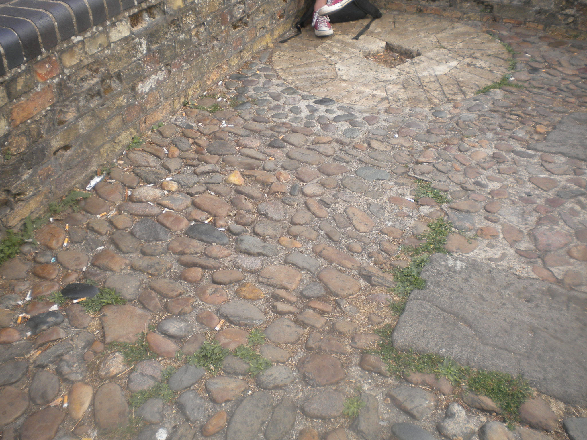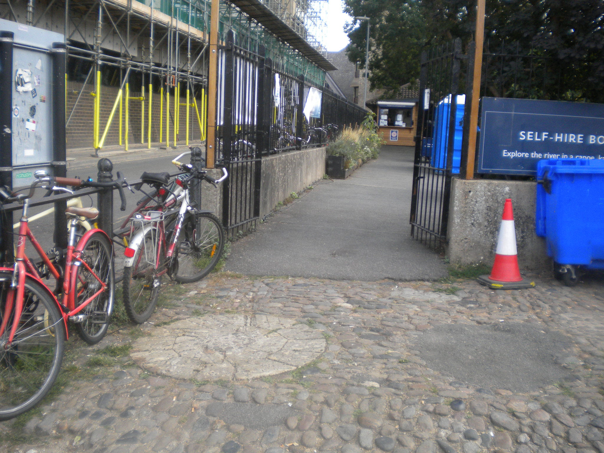 From Silver Street bridge, walk towards the Anchor pub. Next to the pub, turn down a little lane called Laundress Lane, which will take you down to the river edge. At the end of the lane you can see a notice firmly restricting types of traffic! |