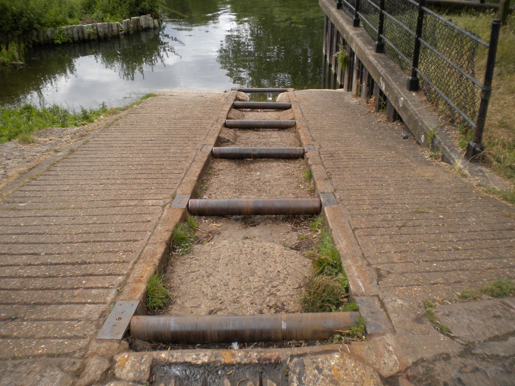 Just beyond the sluice gates, you will see the rollers. Punts from the Backs can't go past the weir. If they go the other side of Laundress Green, they can't get through. But if they go along the bit of river between Laundress Green and Sheep Green, they find these rollers. It's possible to drag a punt up them and get it onto the upper river. You must not do this with a hired punt. Hire one of the upper river punts instead, above the weir. |