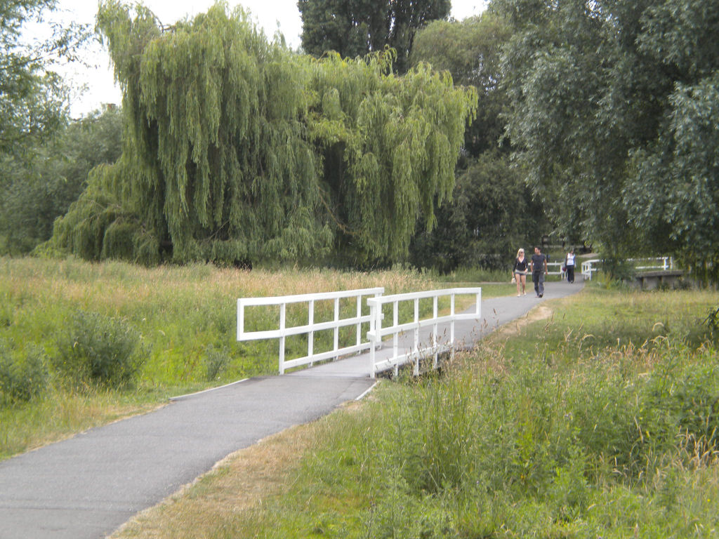 The name of Coe Fen may come from 'Cow Fen', so sheep were grazed one side of the river and cows the other. Coe Fen is more open than Sheep Green. (There is another suggestion that it is a corruption of coo - middle English for Jackdaw.) There is a ditch running right along the length of Coe Fen, with only a couple of bridges across, so stick to the paths. Walk over this little bridge. |