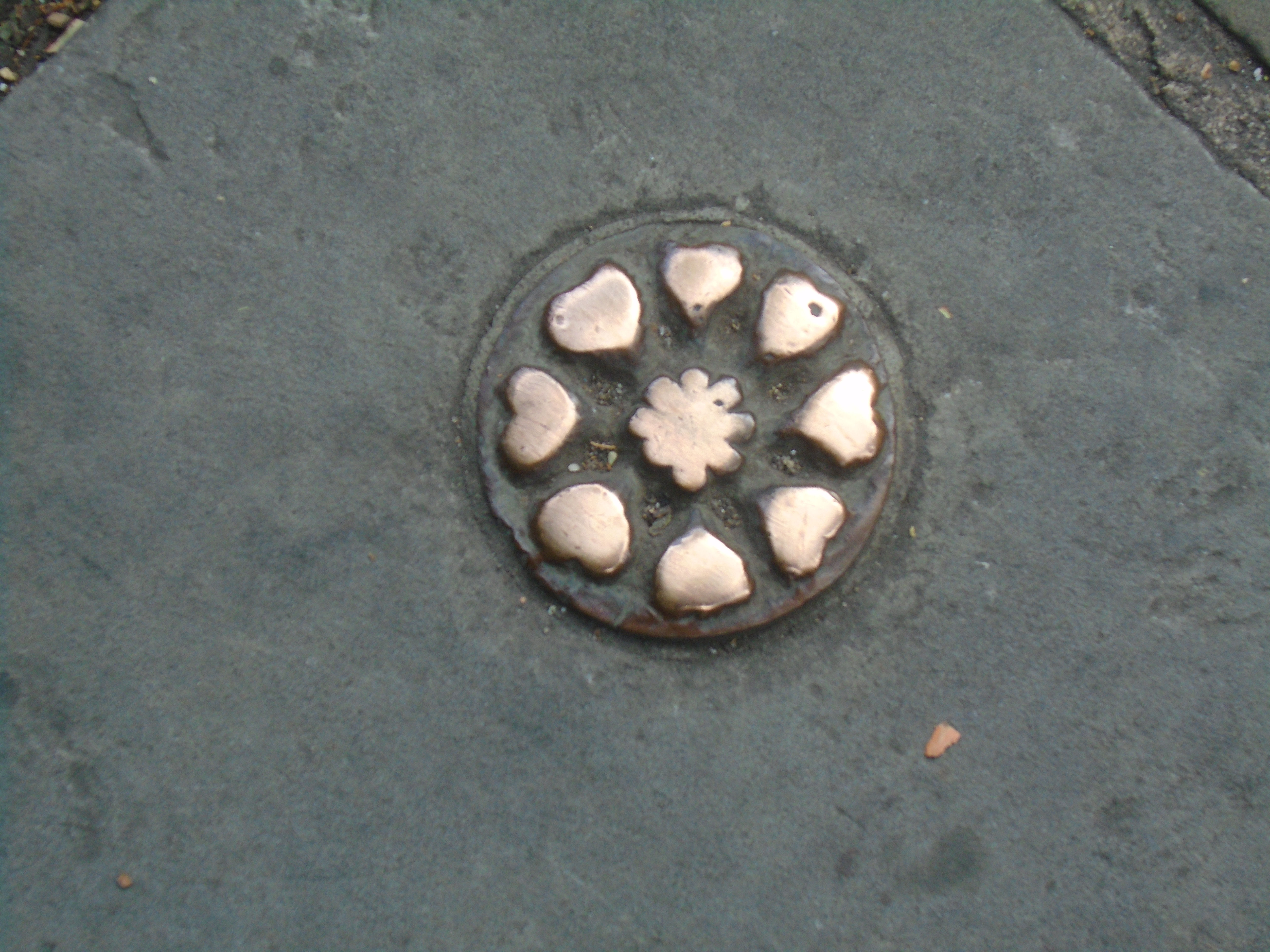 The entrance of the Downing Site is in Downing Street. Walk in and turn slightly towards your left. In the paving, you will see two human-sized foot prints (see right). Apparently this installation is a human figure buried up side down with only the soles of the feet showing. There is no information near-by about it, and you can walk right over it without seeing it if you're not careful. It is dated 2002, and it is called Earthbound: Plant. Here are some photos of it being installed, from here.