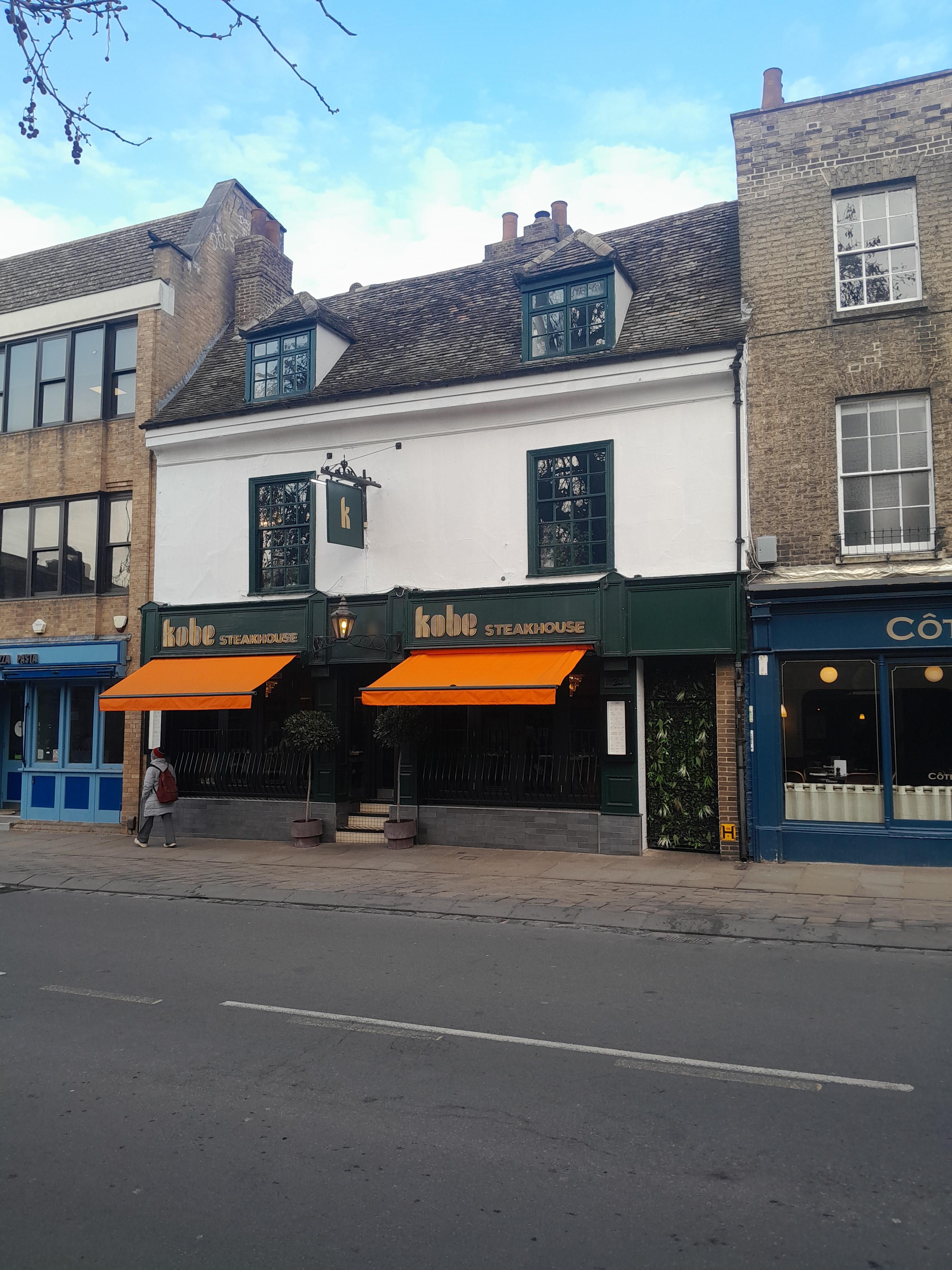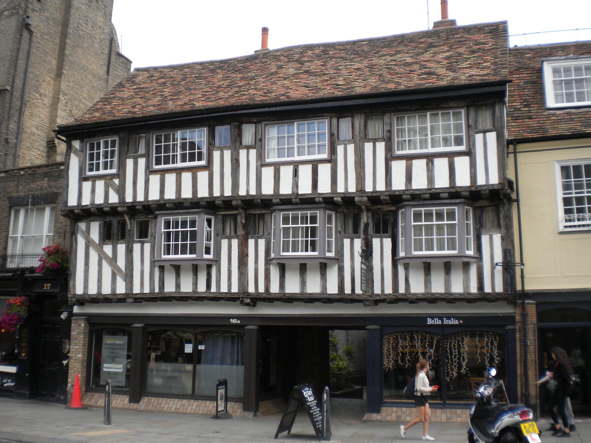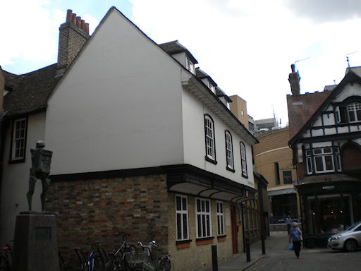 Petty Cury is among the oldest street names in Cambridge. It means "Little cooks street". Unfortunately, most of the buildings aren't particularly old. One is: 32-33, Petty Cury, the only listed building, grade II. It is C16 in origin. Note thje jetty!