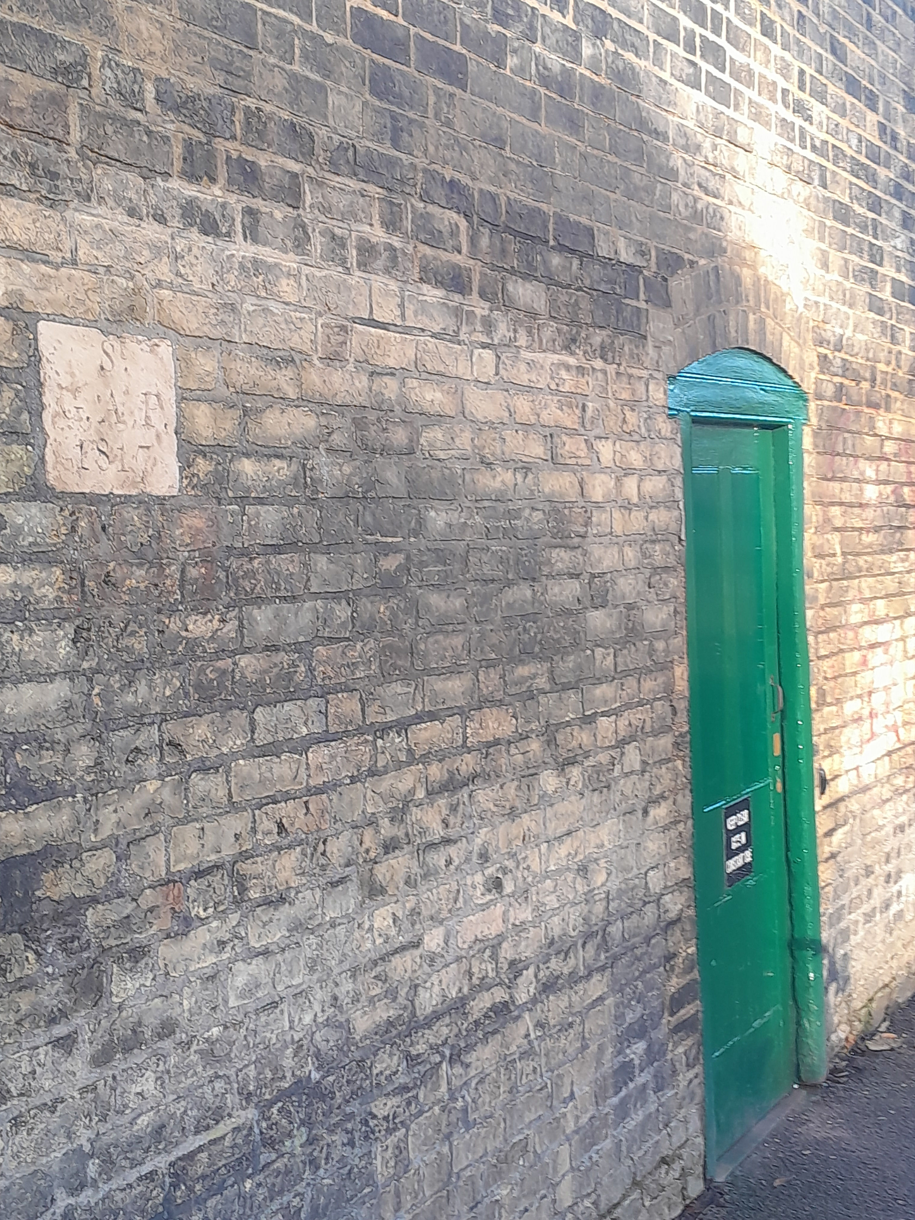 This parish boundary mark is on Milton's Walk, in Christs Pieces, on the wall of Christs College, near Drummer St bus station. There are two green doors. This one is near the right hand door. It is dated 1817. It marks the boundary of St Andrews the Great parish. Great St Andrews church is near by. The parish bordering it was Holy Trinity.