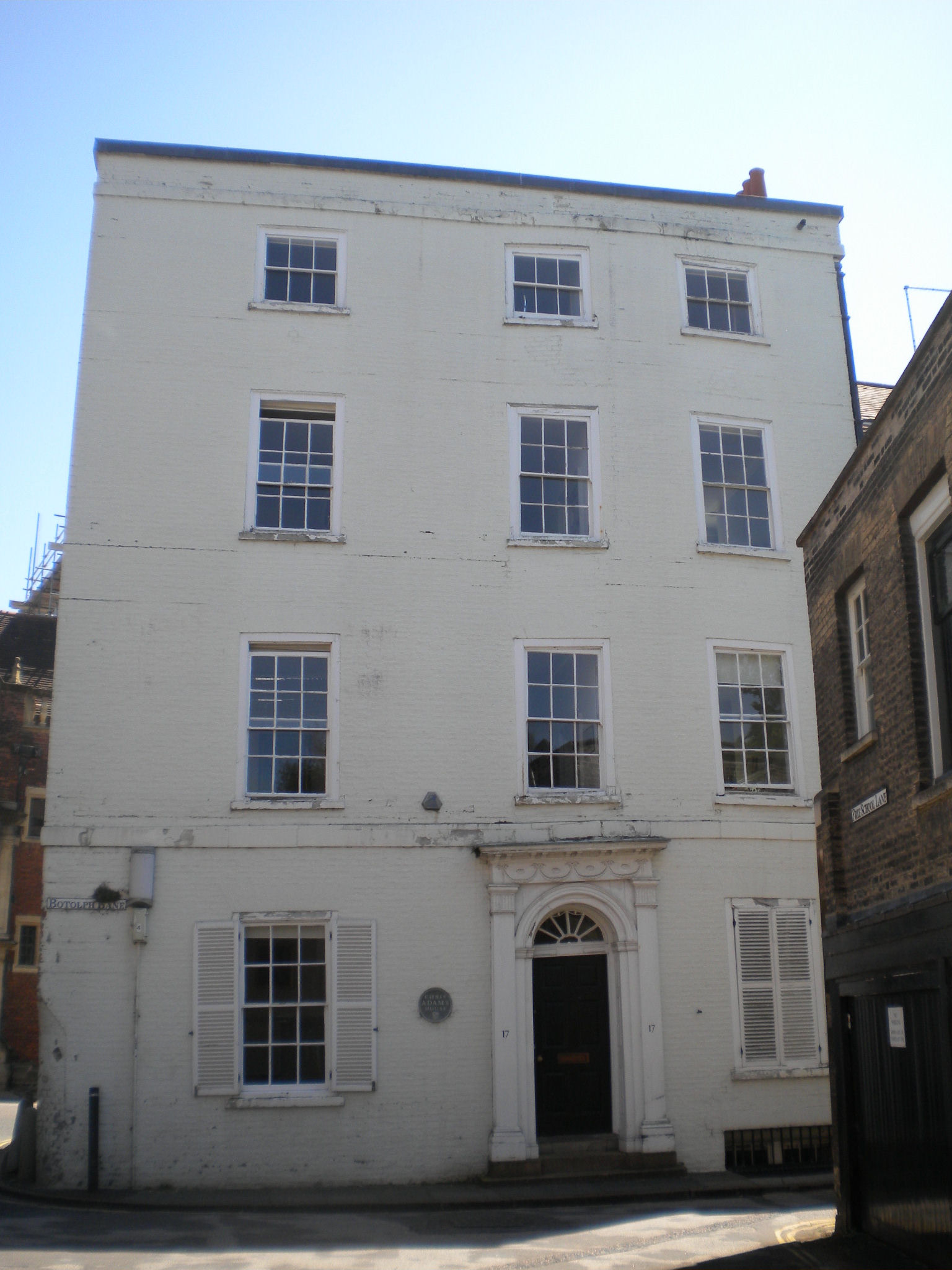 If we turn into Free School Lane, we can see the white building called Charles Adams House (formerly Botolph House). It is circa 1790, and grade II. But there is something else interesting about it. You can see that above the door, and some of the windows has sagged. The map shows that the King's Ditch went right under the house, and this has caused subsidence problems!