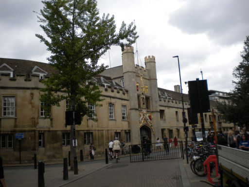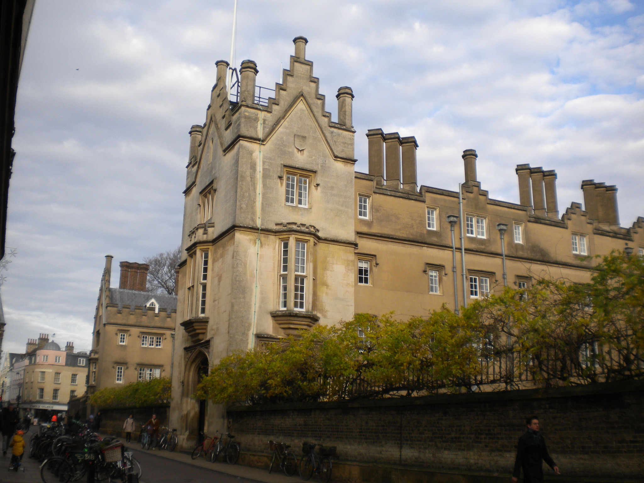 At the end of Hobsons Street is Christ's college is listed grade I. It dates from early C16. Its gatehouse looks similar to St Johns College, with yales and marguerites, because they had the same founder, Lady Margaret Beaufort, who was the mother of Henry VII.