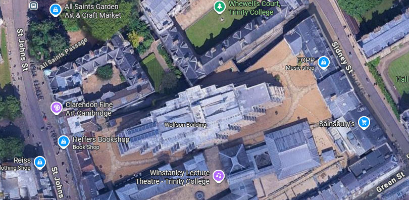 If you look to your right, you can see the Wolfson building. A sattelite photo of Cambridge shows the size of this student accomodation block, but it's almost invisible at ground level.