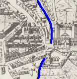 Notice the sharp left turn between King Street and Hobson Street. This is the point that we pick up the Kings Ditch again. Hobsons Street is odd, with a backstreet feel about it. It runs along the path of the Kings Ditch. It doesn't exist on the Tudor map (see bottom of this page). The 1789 map shows it (called King Street) with the Kings Ditch running down it. The ditch may have been underground by that time, though. the modern Kings Street and Hobson Street have rather a confusion of names. King St started as Walls Street, and Hobson Street was originally King St, presumably after the King's Ditch. The modern names were used in an 1840 map.
