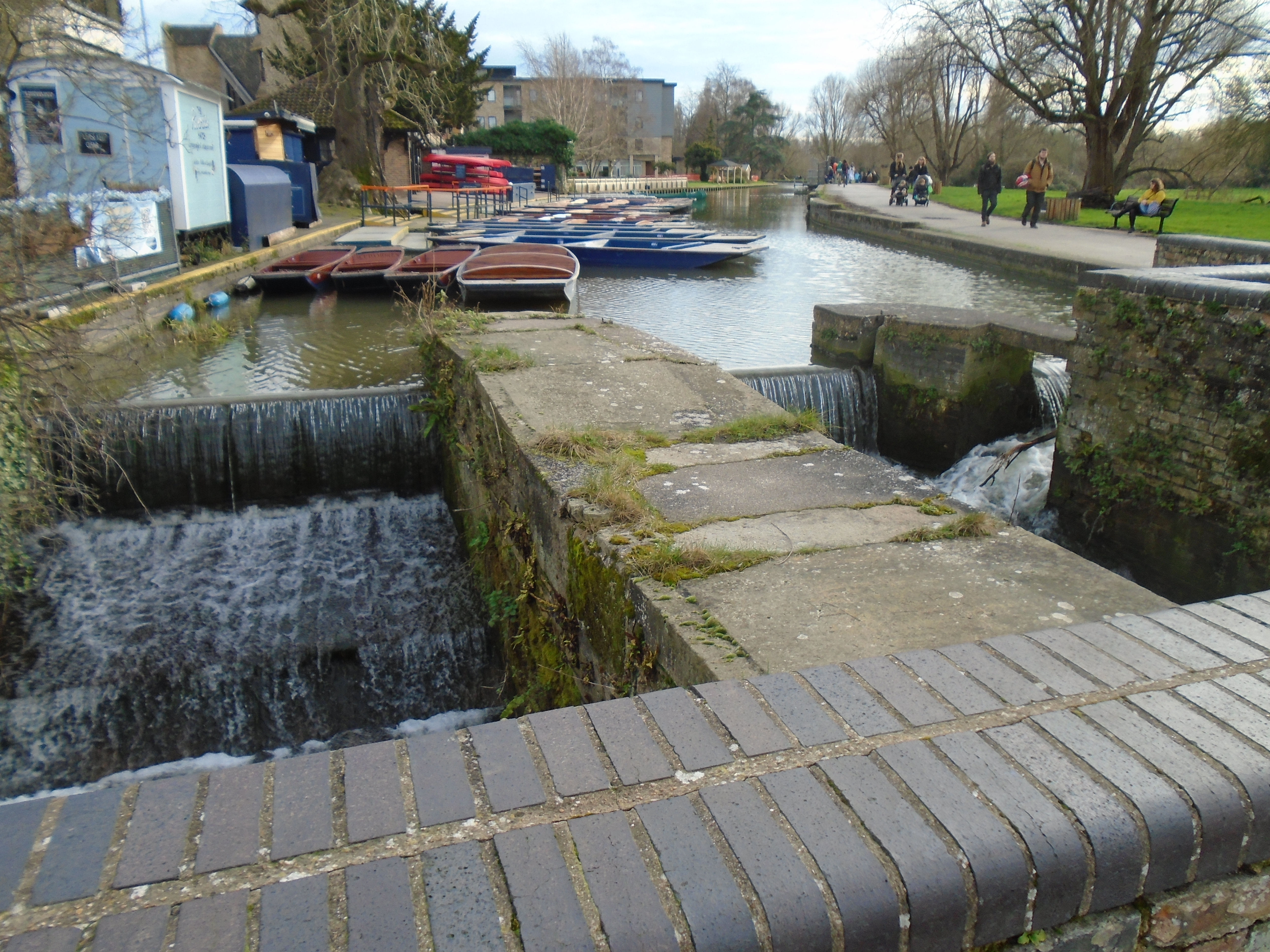 When you cross the weir, you are in Laundress Green. This is actually an island. The Cam flows from Grantchester, but upriver from here, it divides in two, the main channel, and a smaller stream called Snob Stream. Then they rejoin below the weir - the photo, taken from Silver Street bridge, shows this. Snob Stream was used by the towns people to learn to swim, as it was shallower than the main river. "Snob" was the university name for the townsfolk. (Thackeray wrote "Book of Snobs", which used the modern meaning. He went to CambridgeUniversity!) Snob Stream flows under Newnham Mill, another old mill, although the building is 19C. The stream used to power it.