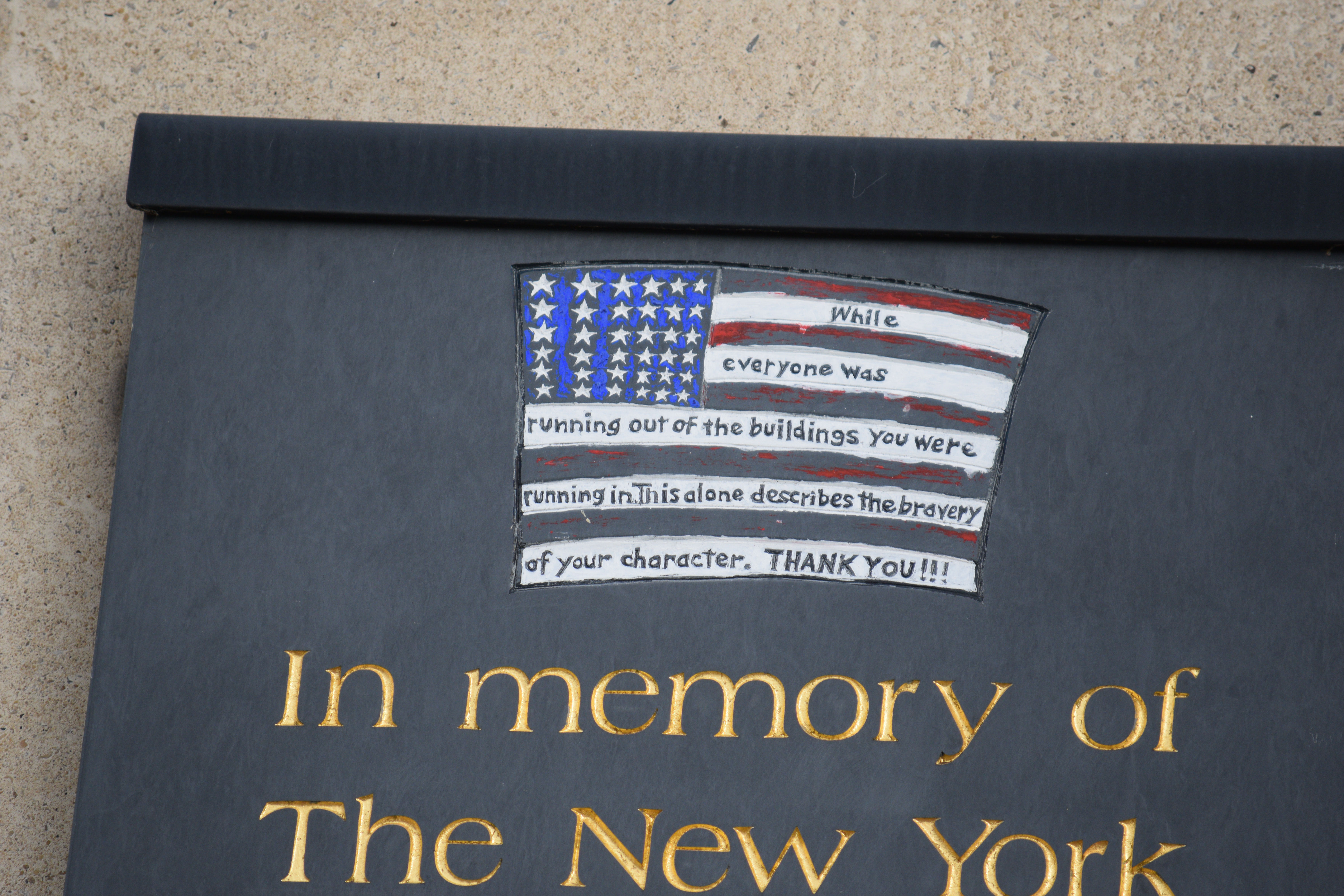 There is a memorial on the fire station to the firemen who died in the 911 attack, by the Cambridgeshire fire service. It is . There is some writing on the representation of the US flag. It says "While everyone was running out of the buildings you were running in. This alone describes your bravery of your character. THANK YOU!!!"