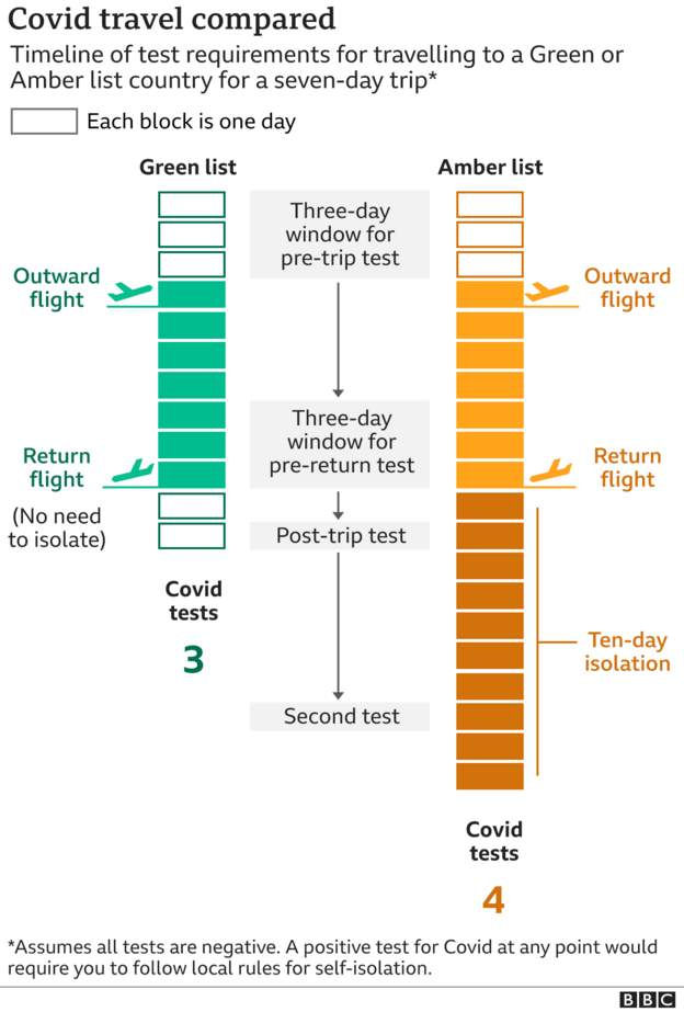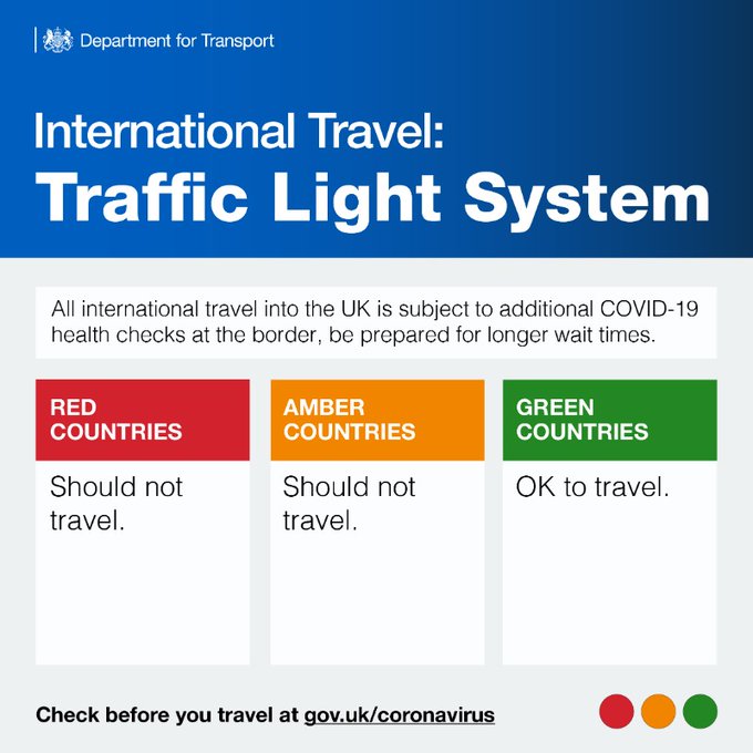 Traffic light system for foreign travel. People returning to the UK require proof of a negative test, taken within 3 days before the service on which they will arrive in England departs. Those returning from amber countries must also book and pay for day 2 and day 8 COVID-19 travel tests for when they return to the UK; only the day 2 test is required for those returning from green countries.