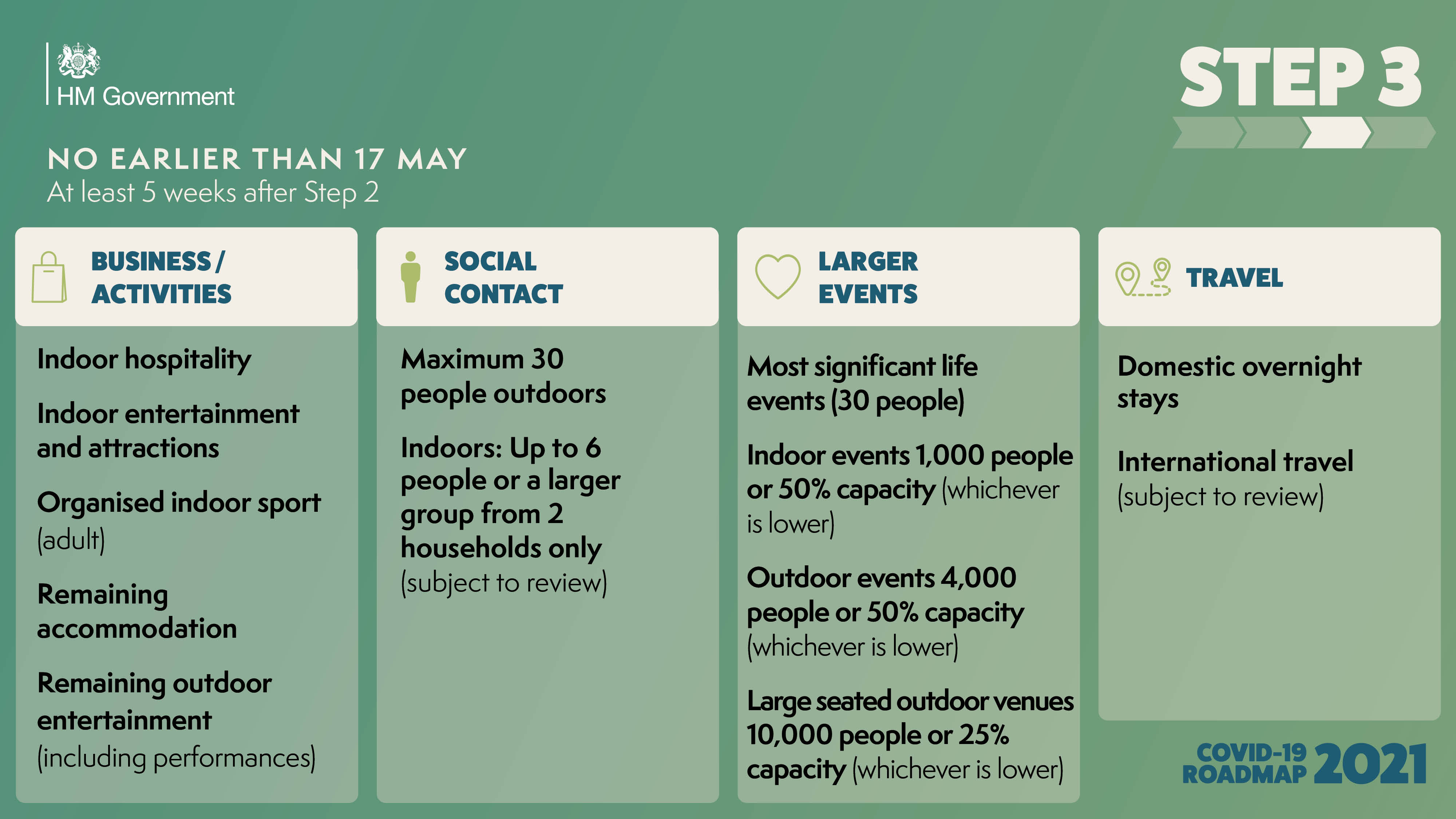 | May 17 | Step 3: indoor hospitality open. Rule of 6 indoors, groups of 30 outdoors.