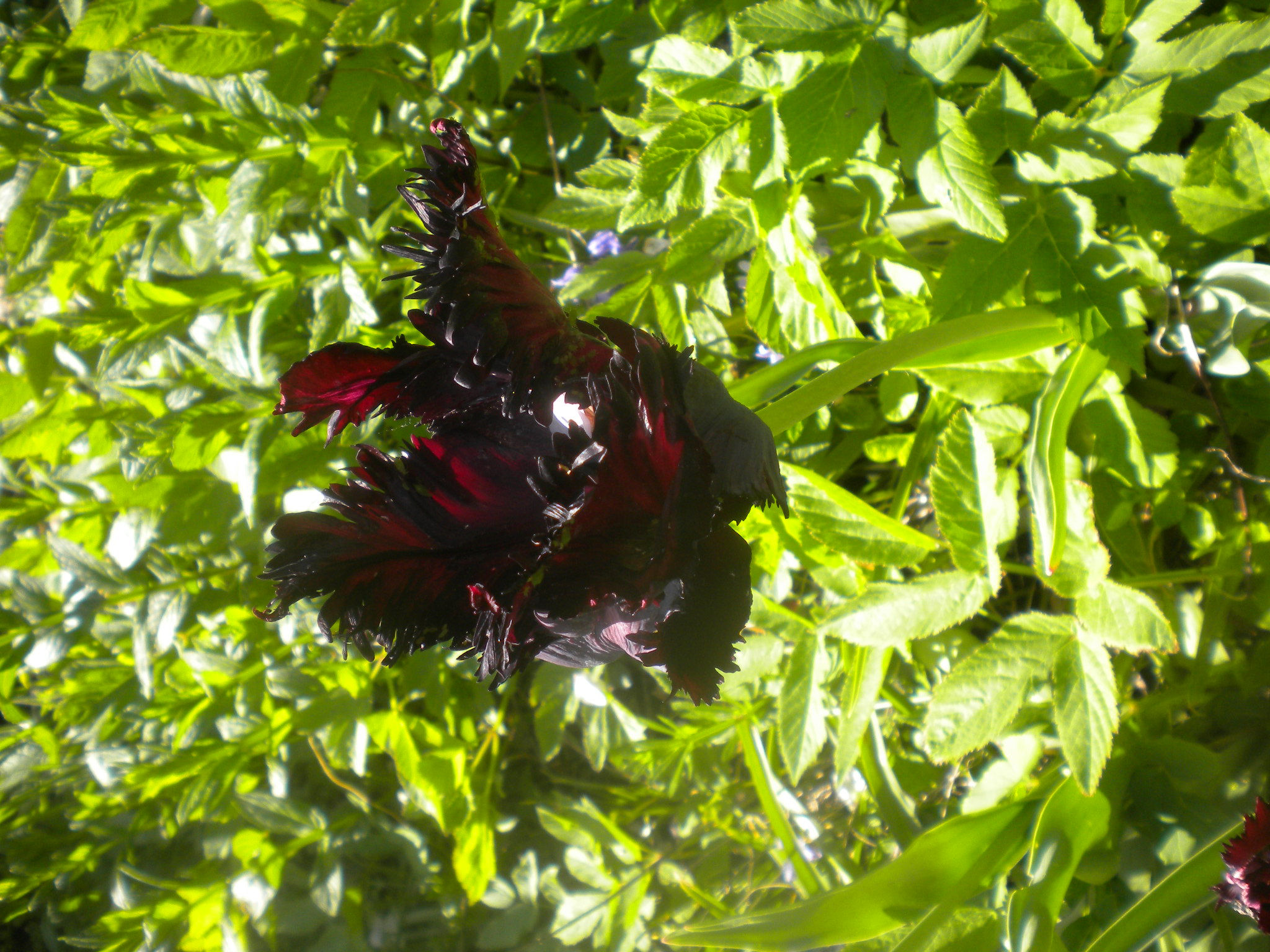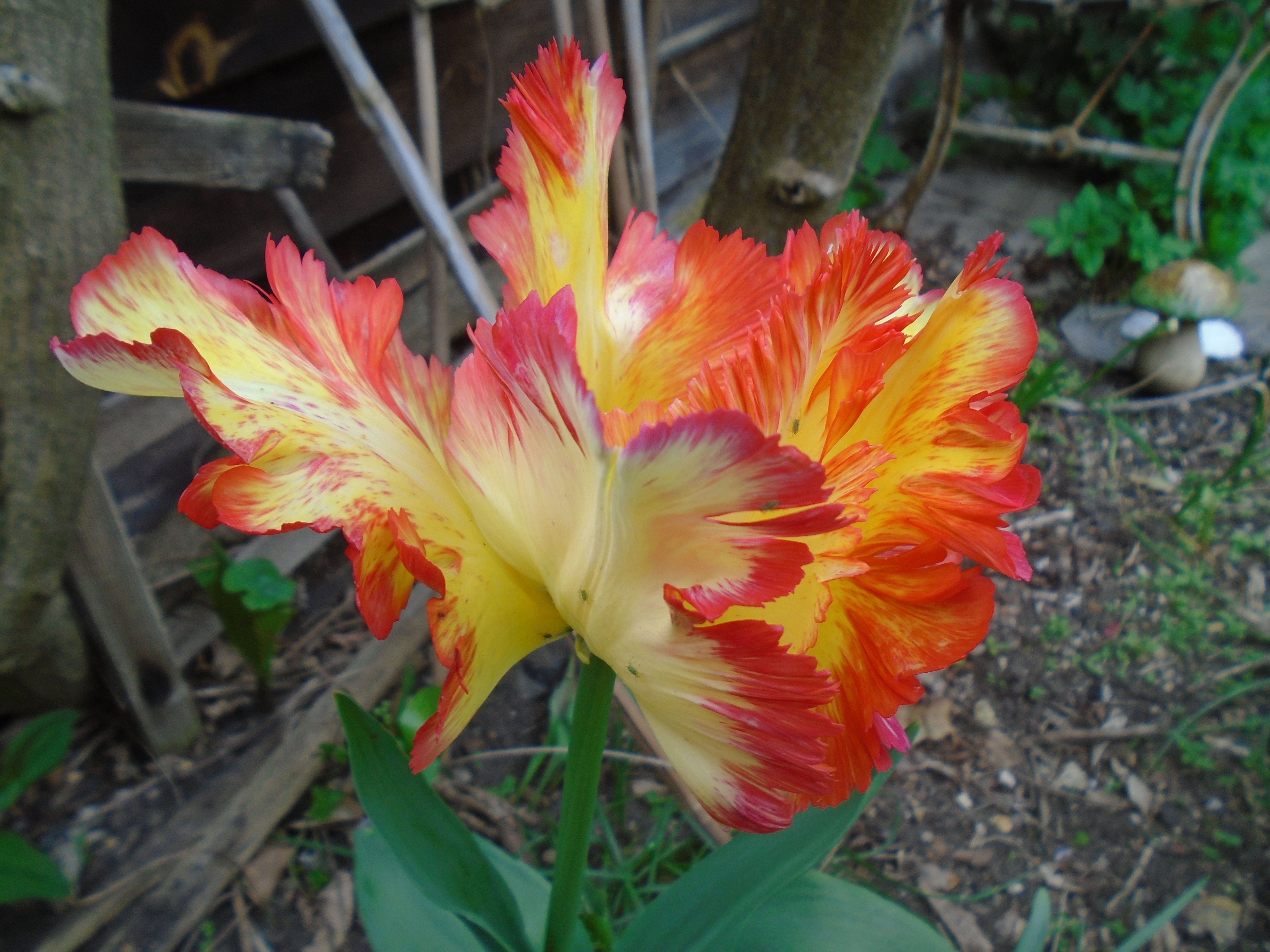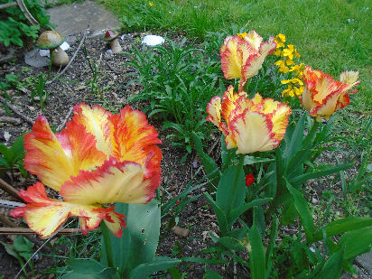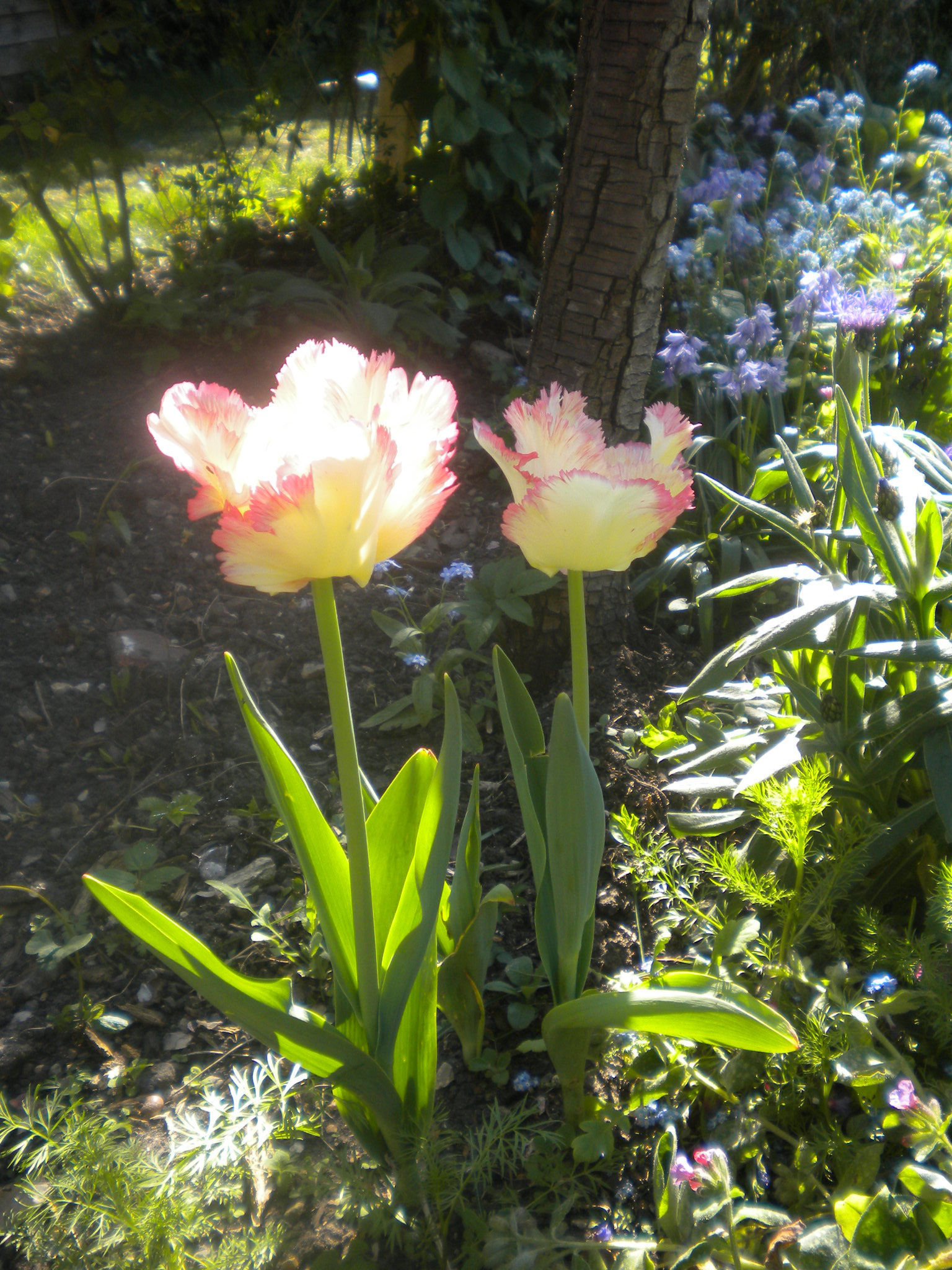 Tulips are usually thought of as very formal flowers with severe shapes. There are certainly tulips like that, but there are a lot of different varieites, and I prefer the others! These were bought from Bloms. Some are small, early tulips. Some are multi-coloured. But my favourite are the parrot tulips, with feathery petals. They can have more than one colour. As they flower, they get more and more weird in shape! We call them Triffids.