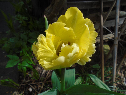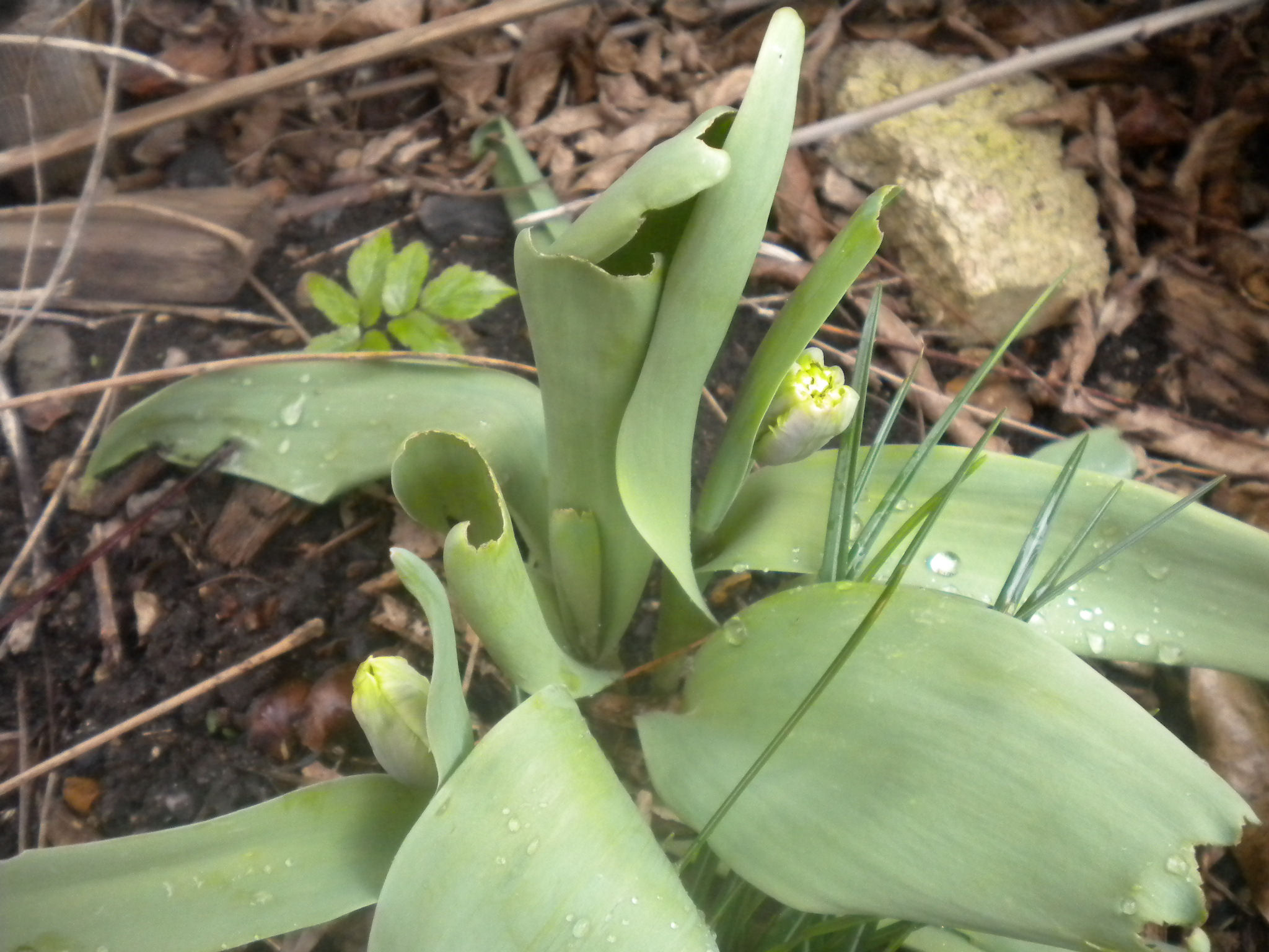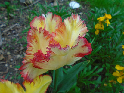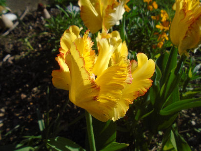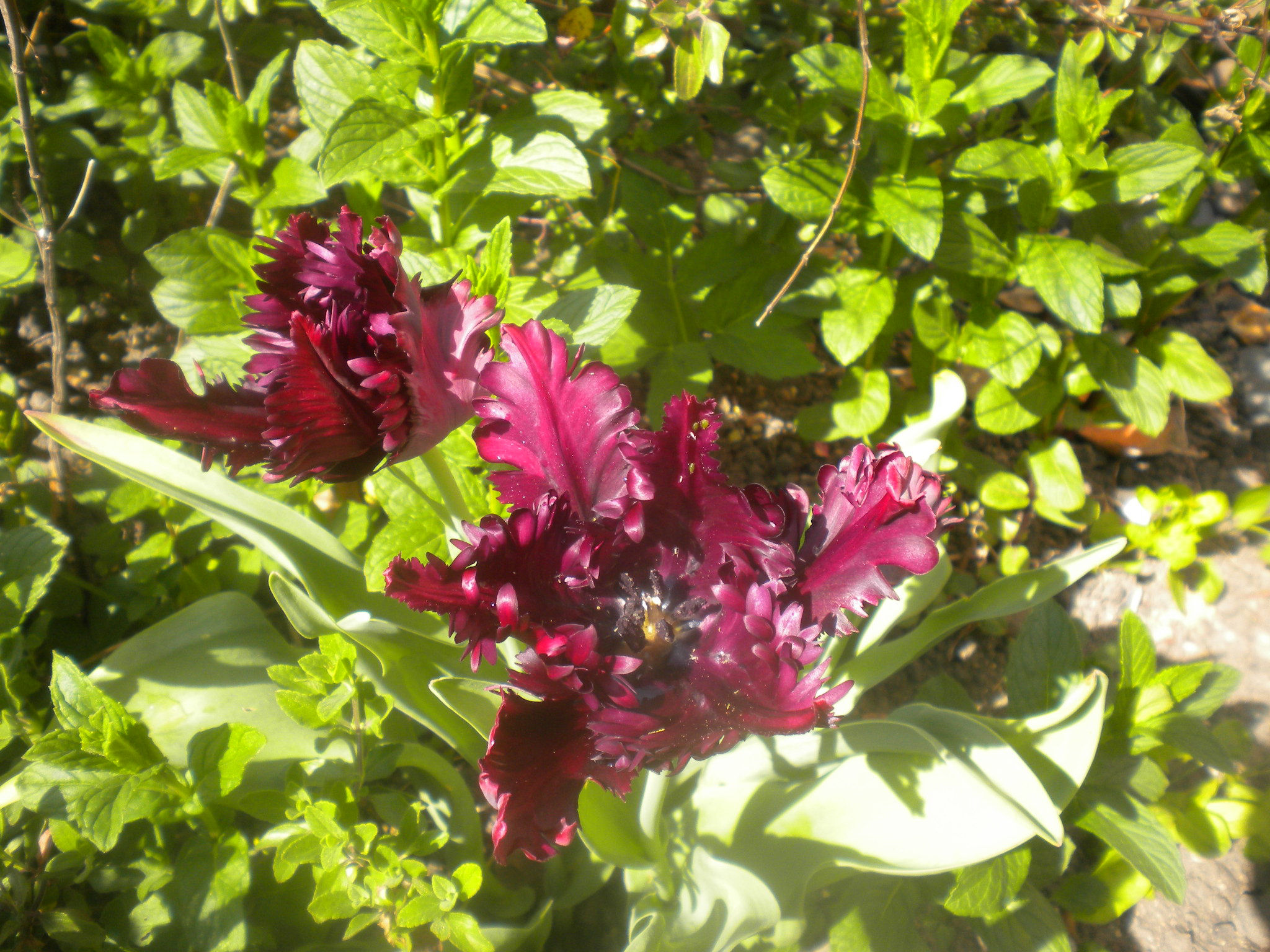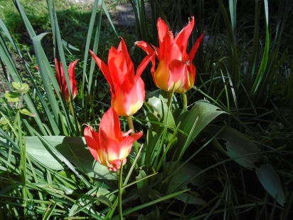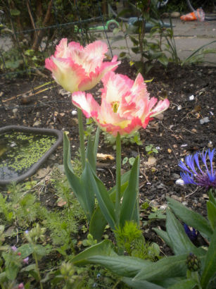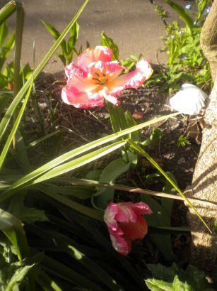 Tulips are usually thought of as very formal flowers with severe shapes. There are certainly tulips like that, but there are a lot of different varieites, and I prefer the others! These were bought from Bloms. Some are small, early tulips. Some are multi-coloured. But my favourite are the parrot tulips, with feathery petals. They can have more than one colour. As they flower, they get more and more weird in shape! We call them Triffids.