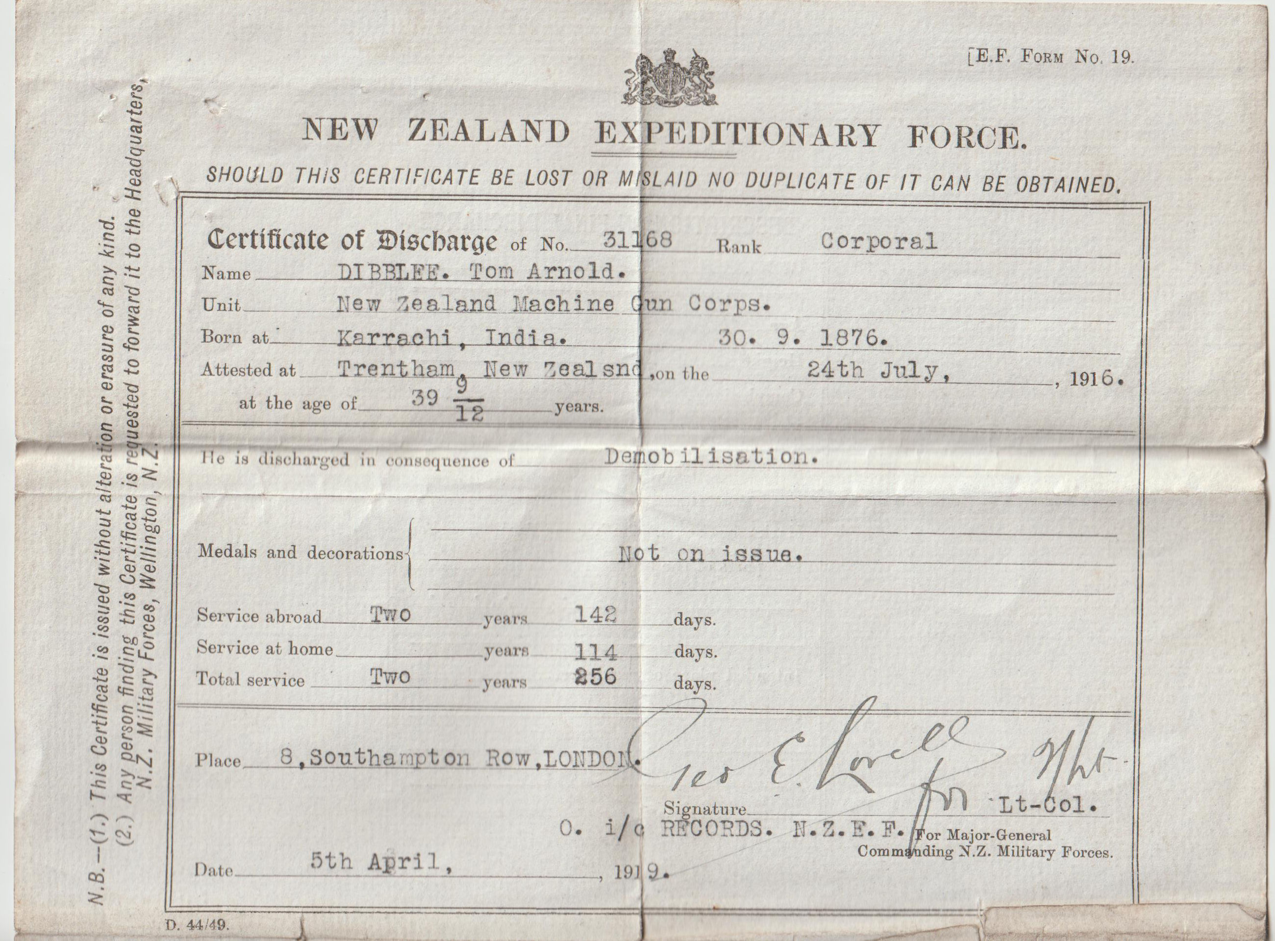 This says that Tom served in the New Zealand Expeditionary Force, from 24 Junly 1916 to 5 April 1919, and was discharged because of Demobilisation. He served 2 years 256 days, of which 2 years 142 dys were abroad.