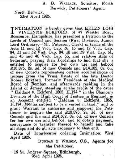 Until there was an heir of entail in possession competent to make the necessary application to the Court of Session, the accumulations of the income of the trust fund were carried to the credit of an account in the administration action entitled 'income and accumulations of income' and whenever that account exceeded £8000 that amount was carried to an account entitled 'moneys subject to be invested in land' and the income of the last-mentioned account was paid to the heir of entail in possession for the time being. The first heir of entail in possession born after the death of the testator was Douglas Eckford and he on attaining the age of 21 years applied to the Court of Session and by order of that Court the money standing to the credit of the 'moneys subject to be invested in land' account was paid out to him. Two further accumulated sums of £8000 were subsequently paid to Douglas Eckford on similar applications. On his death in 1912 his daughter Helen Eckford who was born in 1905 became heir of entail in possession and during her minority two further accumulated sums of £8000 were carried to the 'moneys subject to be invested in land' account and pursuant to an order of the Court of Session were paid out to her when she attained the age of 21 years. Subsequently during her lifetime, three further sums of £8000 were paid out to her as the accumulations of income reached that sum and the appropriate application was made by her to the Court of Session.