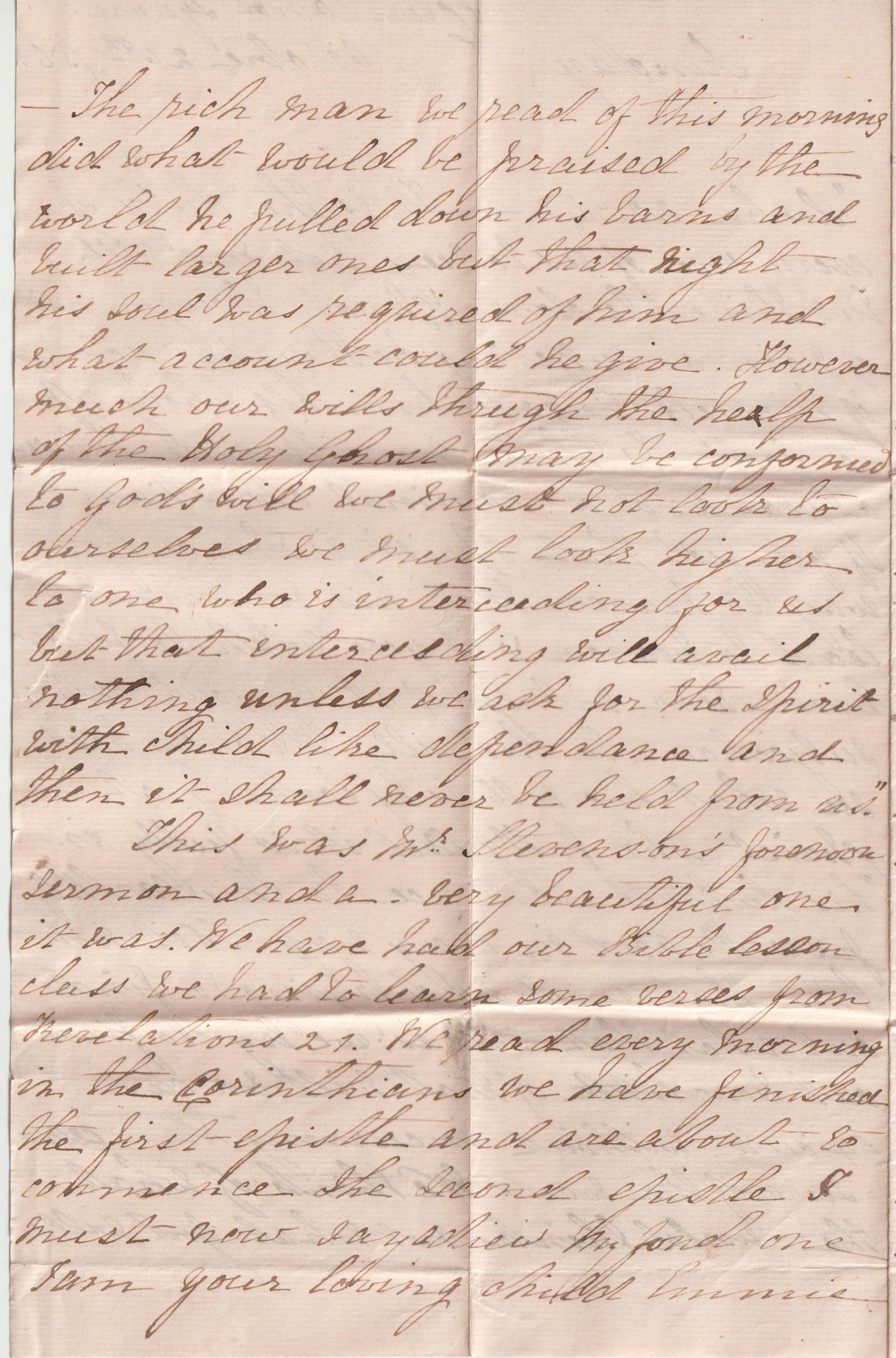 This was Mr. Stevernson's forenoon sermon and a very beautiful one it was. We have had our Bible lesson class. We had to learn some verses from Revelations 21. We read every morning in the Corinthians. We have finished the first epistle and are about to commence the second epistle. I must now say, adieu, my fond one, I am your loving child, Emmie.