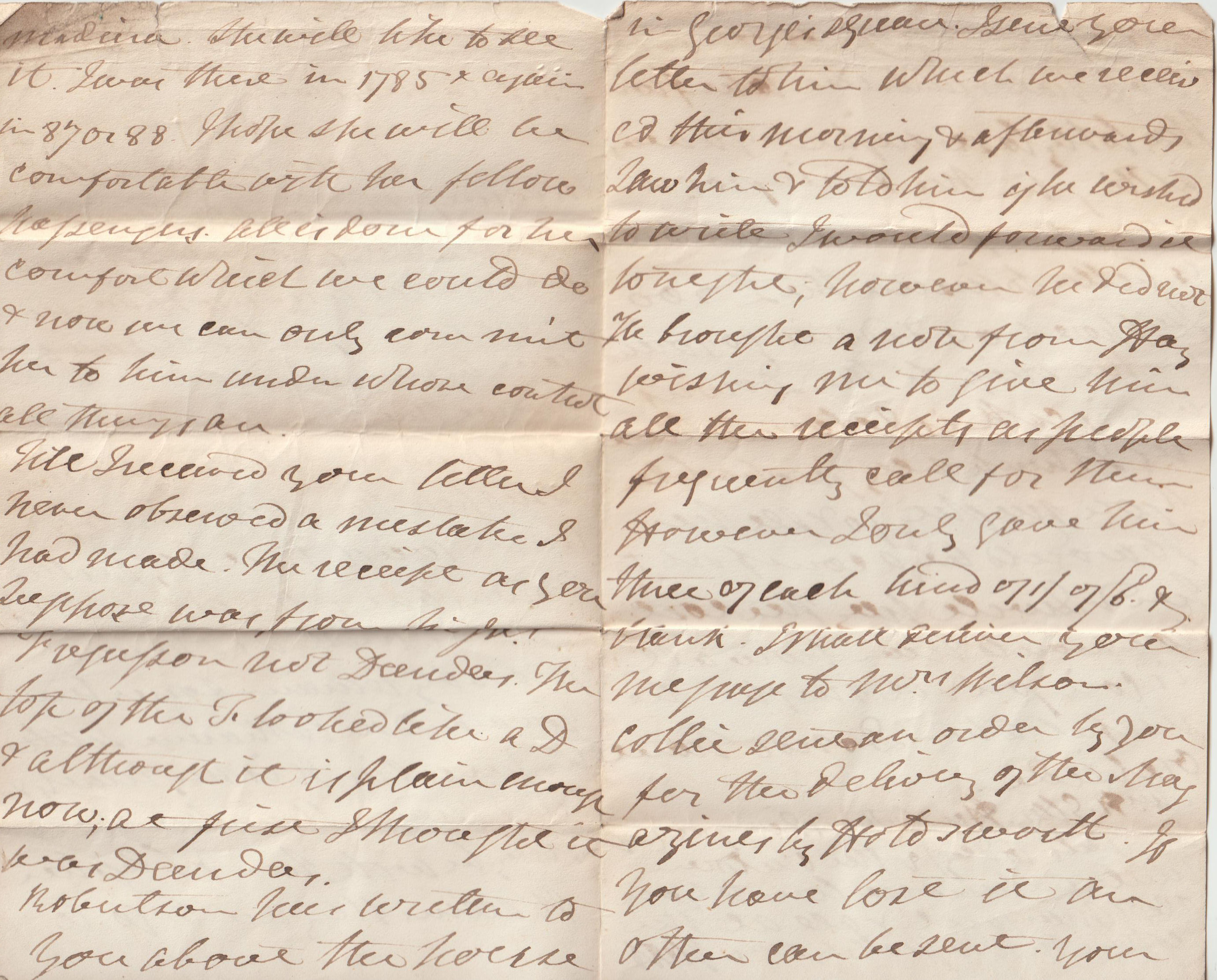 I observe that you were to go to Gravesend on Saturday morning, and I suppose the ship would get under weigh that day for the Downs, but if the wind is the same as with us, she will probably remain some time. You would see Catharine settled in her cabin. It is my heart's desire and prayer that the Lord may be with her and bless her. It seems they are to go to Madeira. She will like to see it. I was there in 1785 and again in 87 or 88. I hope she will be comfortable with her fellow passengers. All is done for her comfort which we could do, and now we can only commit her to him under whose control all things are.