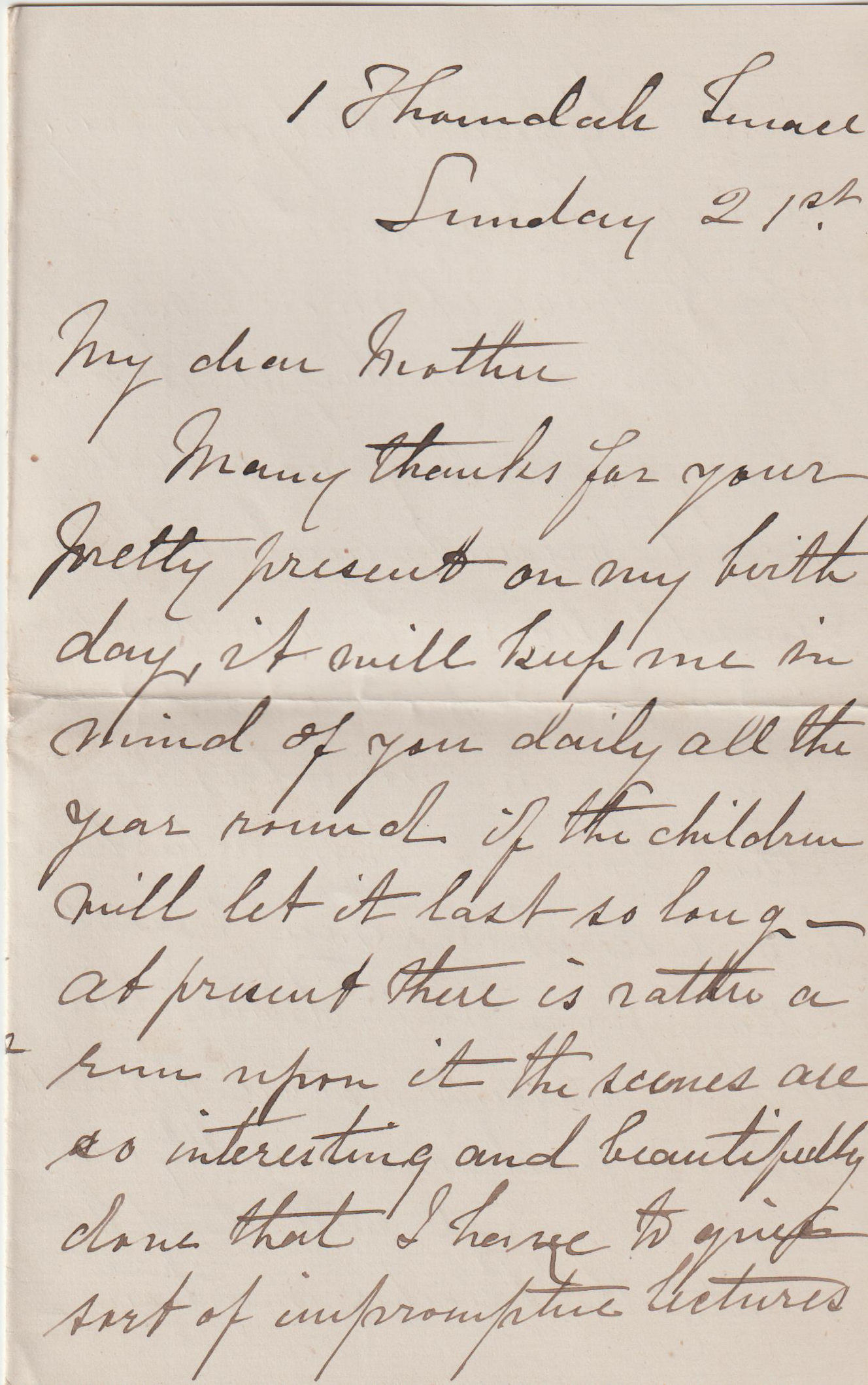 Many thanks for your pretty present on my birthday. It will keep me in mind of you daily all year round if the children will let it last so long. At present there is rather a run upon it. The scenes are so interesting and beautifully done that I have to give a sort of impromptue lectures on the different subjects every evening but bye and bye I hope to have it more to myself. You have a wonderful art of always sending me a really useful present and so keeping yourself always in my mind, the little knick knacks I use every day are mementoes of either you or Emy which is the real secret of a nice present. Ethey's purse reminds me daily of the evanescent nature of small change and consequently carries a good moral with it of the vanity the Preacher mentions.