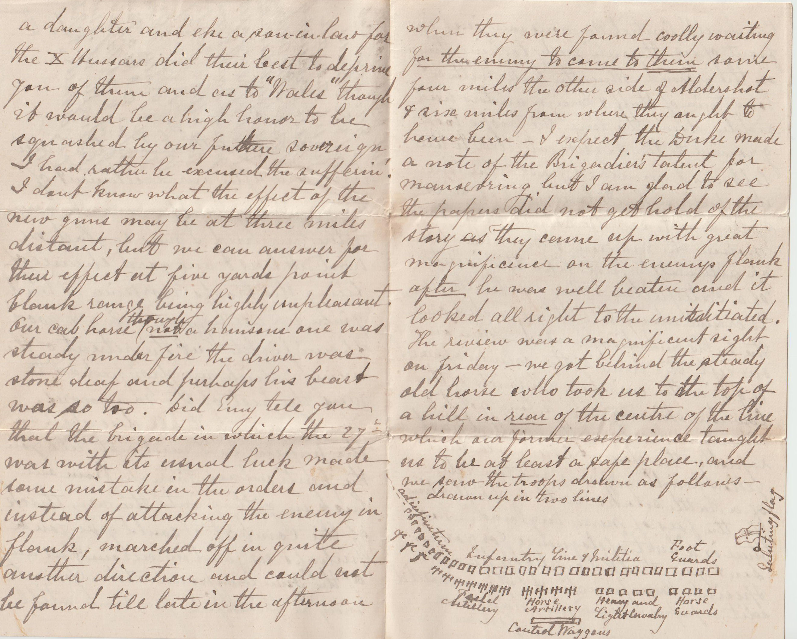 We have settled down to a quiet life again after our excitement of the campaign. It was really very interesting and I was so glad we had at last one good chance seeing the troops working. I had given up all hope of seeing a good sham fight but the retreat of the enemy which we dropped onto was the best of the manoevres. You have seen it all described in the papers so I need not tell you the particulars, though from our luck in getting into the very thick of the combat I could give you perhaps as good an account as any of the "own correspondents". You may be thankful you have still a daughter and eke a son-in-law for the X Hussars did their best to deprive you of them and us to "Wales" though it would be a high honour to be squashed by our future sovereign I had rather be excused the suffering! I don't know what the effect of the new guns may be at three miles distant, but we can answer for their effect at five yards point blank range being highly unpleasant. Our cab horse, though not a hansom one was steady under fire, the driver was stone deaf and perhaps his beast was so too. Did Emy tell you that the brigade in which the 27th was with its usual luck made some mistake in the orders and instead of attacking the enemy in flank, marched off in quite another direction and could not be found till late in the afternoon, when they were found coolly waiting for the enemy to come to them some four miles the other side of Aldershot and six miles from where they ought to have been. I expect the Duke made a note of the brigadier's talent for manoevering, but I am glad to see the papers did not get hold of the story as they came up with great magnificence on the enemy's flank after he was well beaten and it looked all right to the uninitiated. The review was a magnificent sight on Friday. We got behind the steady old horse who took us to the top of a hill in rear of the centre of the line which our former experience taught us to be as least a safe place, and we saw the troops drawn as follows - drawn up in two lines