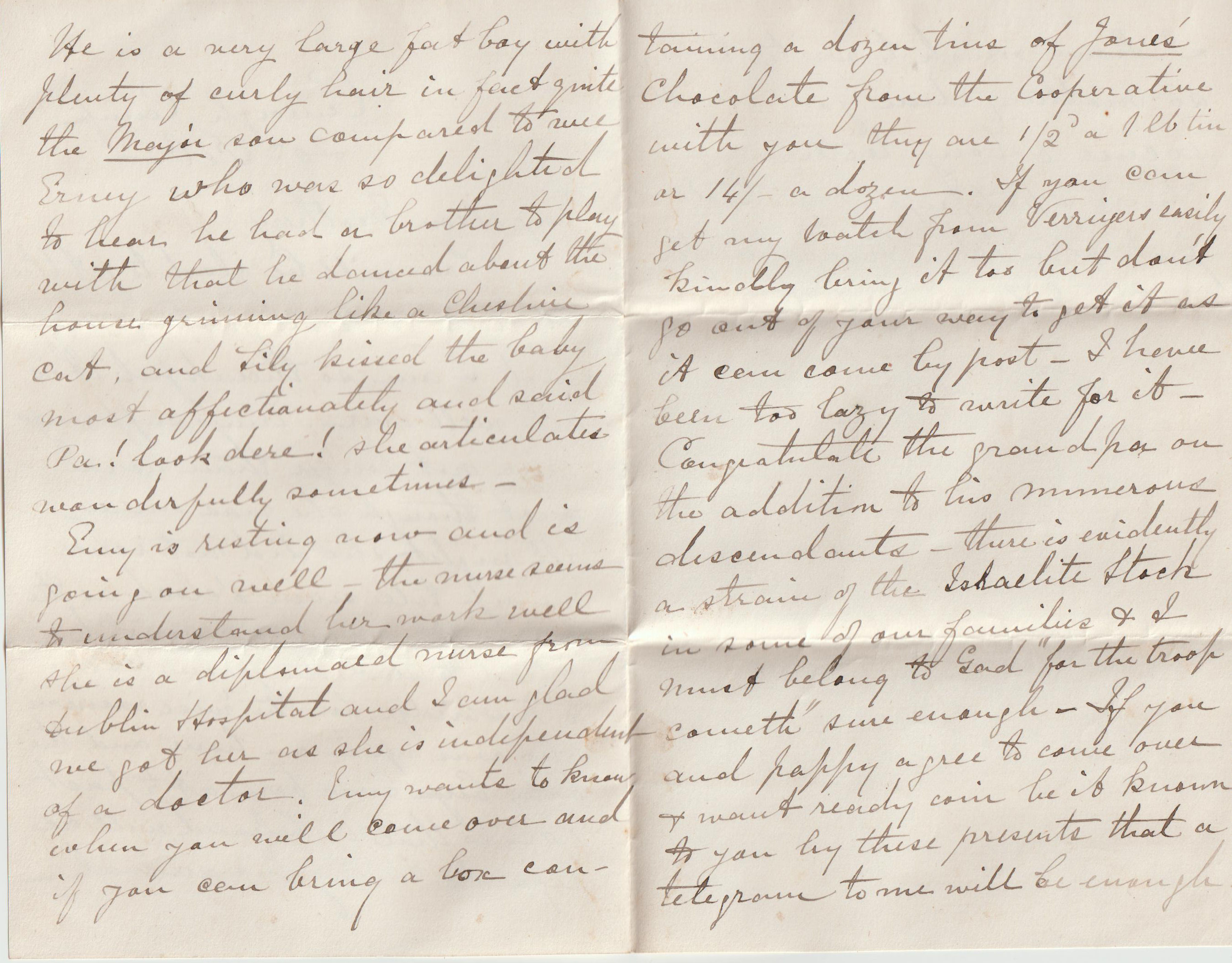 Emy is resting now and is going on well. The nurse seems to understand her work well. She is a diplomaed nurse from Dublin Hospital and I am glad we got her as she is independent of a doctor. Emy wants to know when you will come over and if you can bring a box containing a dozen tins of Jane's chocolate from the Cooperative with you. They are 1/2d a 1lb tin or 14/- a dozen. If you can get my watch from Verrigers easily, kindly bring it too, but don't go out of your way to get it as it can come by post. I have been too laze to write for it.