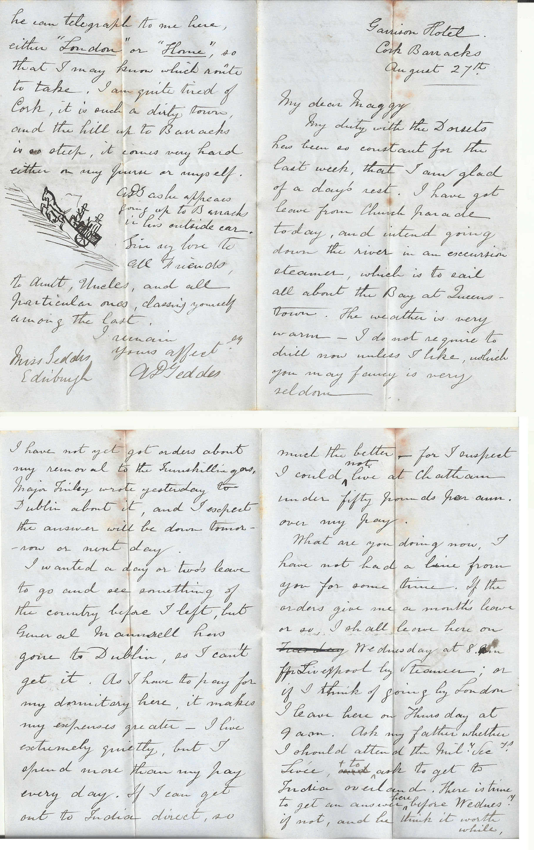 What are you doing now, I have not had a line from you for some time. If the orders give me a month's leave or so, I shall leave here on Wednesday at 8pm for Liverpool by steamer; or if I think of going by London I leave here on Thursday at 9am. Ask my father whether I should attend the Mily. Secrs Levee, to ask to get to India overland. There is time to get an answer here before Wednesy. If not, and he thinks it worthwhile, he can telegraph here, either "London" or "Home", so that I may know which route to take. I am quite tired of Cork, it is such a dirty town, and the hill up to Barracks is so steep, it comes very hard either on my purse or myself. [drawing of horse-drawn vehicle going up a very steep hill] ADG as he appears going up to Barracks in his outside car.